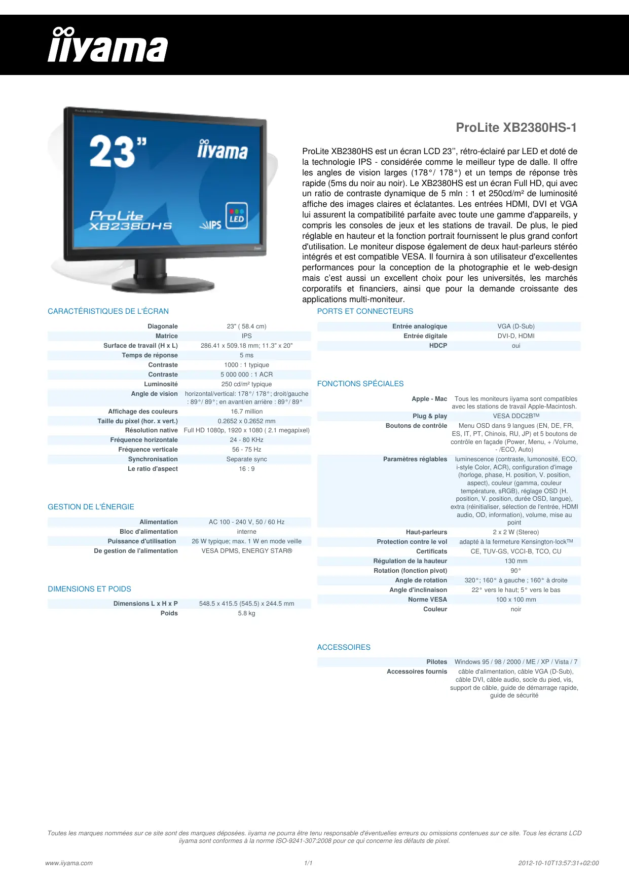 PROLITE XB2380HS - Écran informatique IIYAMA - Notice d'utilisation et mode d'emploi gratuit