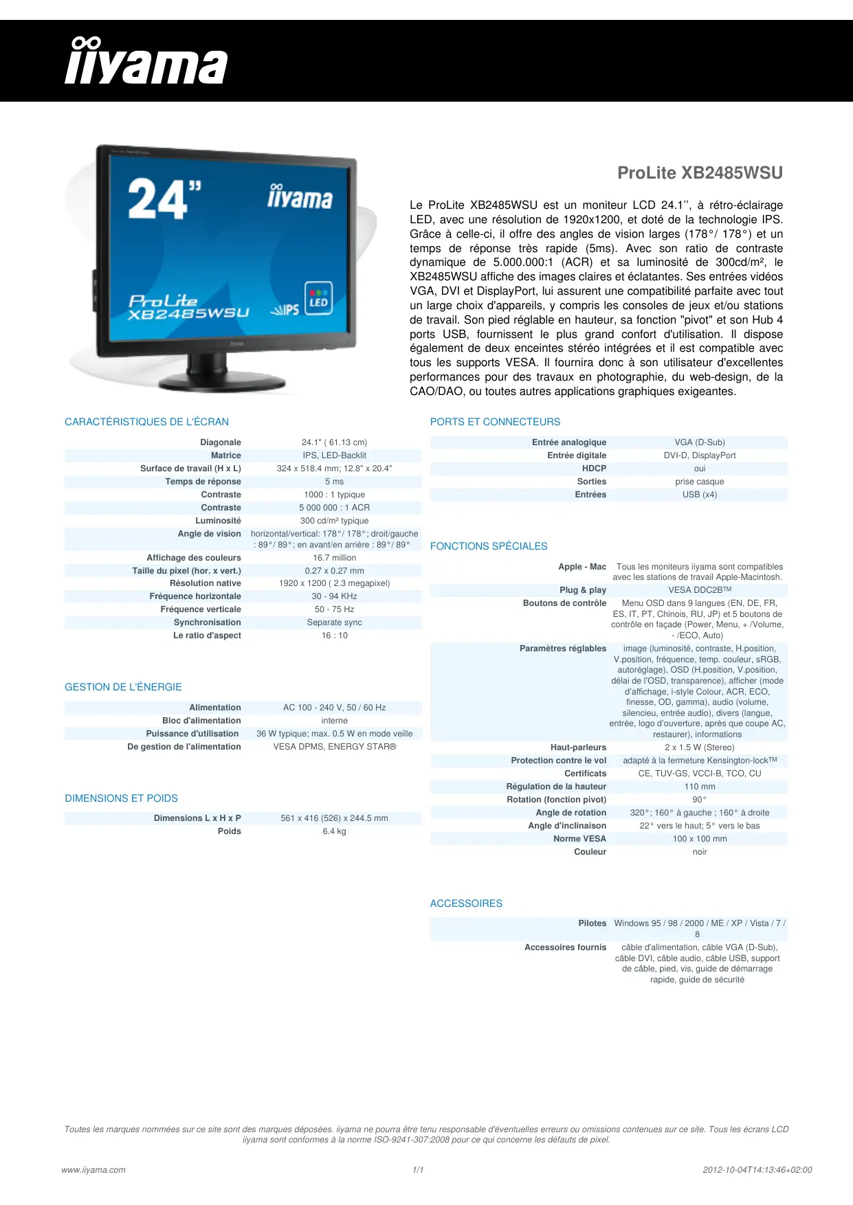 PROLITE XB2485WSU - Écran informatique IIYAMA - Notice d'utilisation et mode d'emploi gratuit
