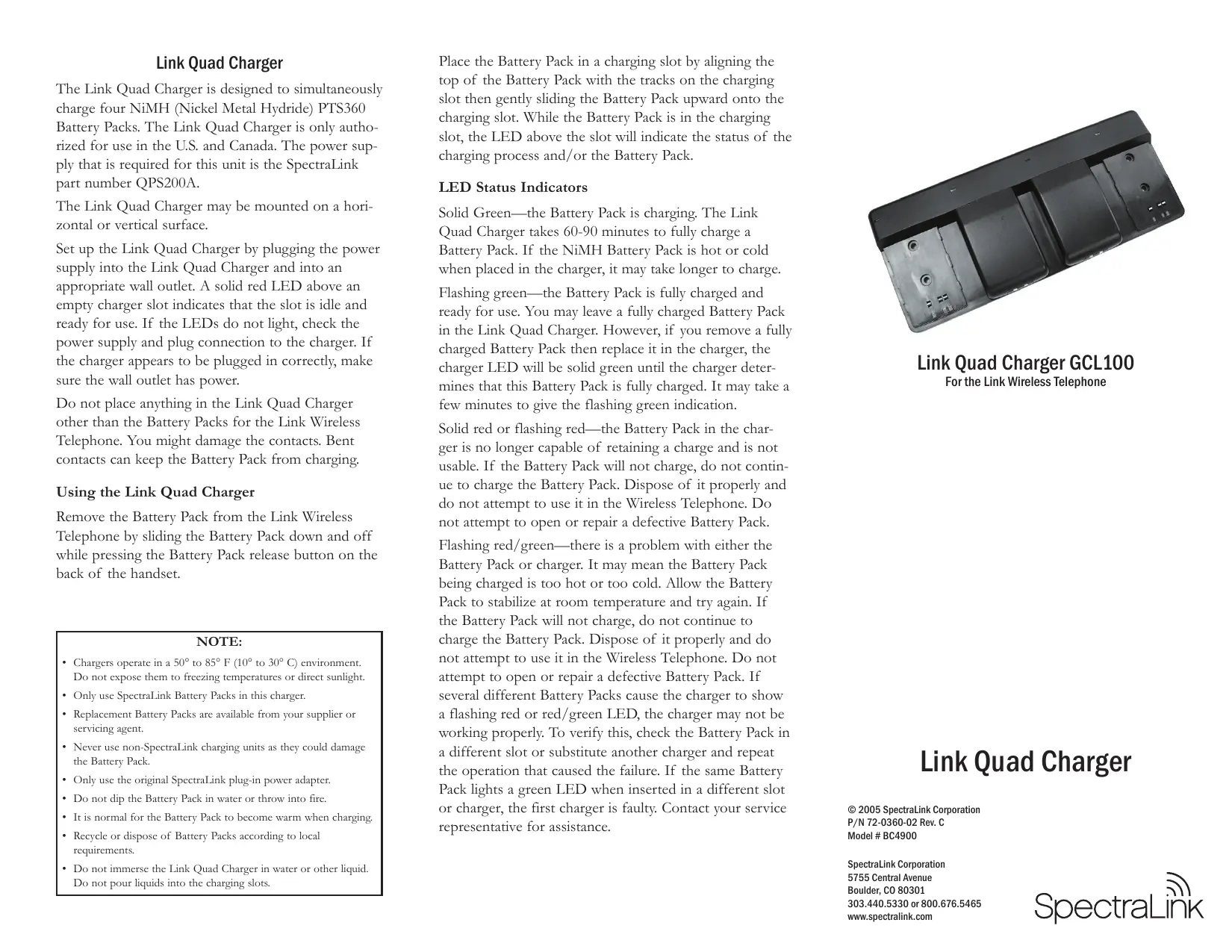 Le Link Quad Charger est concu pour recharger simultanement quatre PTS360 batteries NiMH (hydrude métallique de nickel). L'utilisation du Link Quad Charger est autorisée seulement aux États-Unis et au Canada. Le numéro de piece SpectraLink du bloc d'alimentation nécessaire au fonctionnement de cet apparéil est QPS200A.