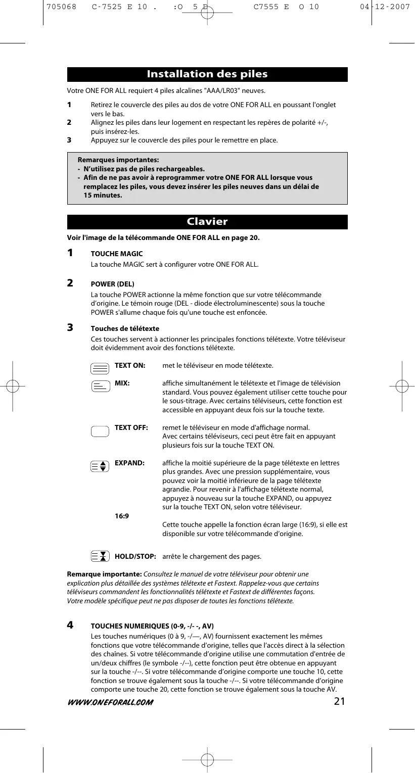 Alignez les piles dans leur logement en respectant les repères de polarité +/-, puis insérez-les. Appuyez sur le couvercle des piles pour le remettre en place. Remarques importantes: - N’utilisez pas de piles rechargeables. - Afin de ne pas avoir à reprogrammer votre ONE FOR ALL lorsque vous remplacez les piles, vous devez insérer les piles neuves dans un délai de 15 minutes.