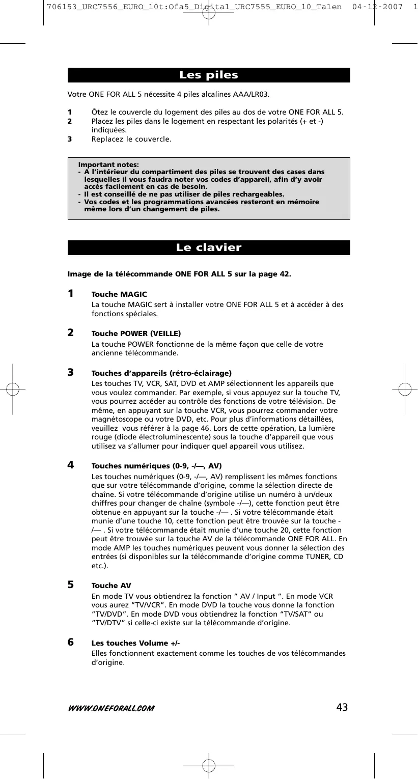 Cette caractéristique vous permet de “copier” ou “transférer” les touches particulières de la télécommande d’origine sur votre nouvelle ONE FOR ALL 5. Les pages suivantes vous expliquent en quelques étapes simples comment personnaliser la ONE FOR ALL 5 afin que’lle s’adapte au mieux à votre environnement audiovisuel. Il se peut que vous ayez besoin de nouveau de ce mode d’emploi dans le futur, aussi nous vous conseillons de le conserver précieusement. WWW.ONEFORALL.COM