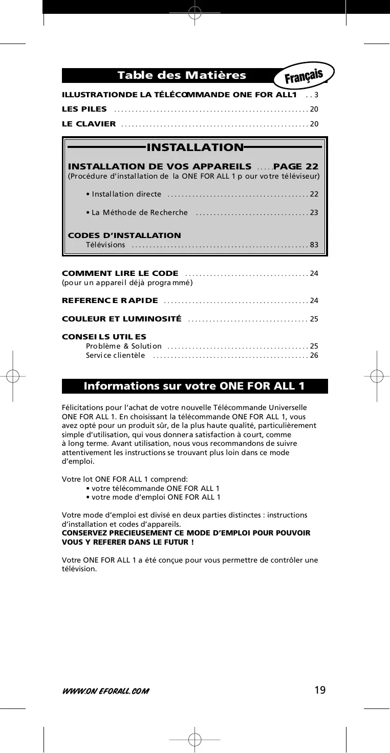 Félicitations pour l’achat de votre nouvelle Télécommande Universelle ONE FOR ALL 1. En choisissant la télécommande ONE FOR ALL 1, vous avez opté pour un produit sûr, de la plus haute qualité, particulièrement simple d’utilisation, qui vous donnera satisfaction à court, comme à long terme. Avant utilisation, nous vous recommandons de suivre attentivement les instructions se trouvant plus loin dans ce mode d’emploi. Votre lot ONE FOR ALL 1 comprend: • votre télécommande ONE FOR ALL 1 • votre mode d’emploi ONE FOR ALL 1 Votre mode d’emploi est divisé en deux parties distinctes : instructions d’installation et codes d’appareils. CONSERVEZ PRECIEUSEMENT CE MODE D’EMPLOI POUR POUVOIR VOUS Y REFERER DANS LE FUTUR ! Votre ONE FOR ALL 1 a été conçue pour vous permettre de contrôler une télévision.