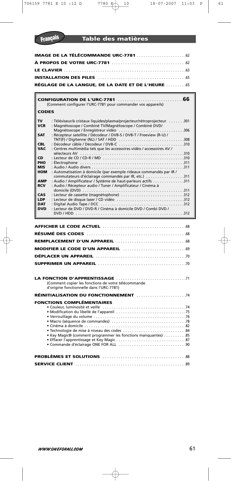 (Comment copier les fonctions de votre télécommande d'origine fonctionnelle dans l’URC-7781) RÉINITIALISATION DU FONCTIONNEMENT . . . . . . . . . . . . . . . . . . . . . .74 FONCTIONS COMPLÉMENTAIRES • Couleur, luminosité et veille . . . . . . . . . . . . . . . . . . . . . . . . . . . . . . . . . . . . .74 • Modification du libellé de l’appareil . . . . . . . . . . . . . . . . . . . . . . . . . . . . . . .75 • Verrouillage du volume . . . . . . . . . . . . . . . . . . . . . . . . . . . . . . . . . . . . . . . . .76 • Macro (séquence de commandes) . . . . . . . . . . . . . . . . . . . . . . . . . . . . . . . . .78 • Cinéma à domicile . . . . . . . . . . . . . . . . . . . . . . . . . . . . . . . . . . . . . . . . . . . . .82 • Technologie de mise à niveau des codes . . . . . . . . . . . . . . . . . . . . . . . . . . . .84 • Key Magic® (comment programmer les fonctions manquantes) . . . . . . . . . .85 • Effacer l’apprentissage et Key Magic . . . . . . . . . . . . . . . . . . . . . . . . . . . . . . .87 • Commande d'éclairage ONE FOR ALL . . . . . . . . . . . . . . . . . . . . . . . . . . . . . .90 PROBLÈMES ET SOLUTIONS . . . . . . . . . . . . . . . . . . . . . . . . . . . . . . . . . . . . .88 SERVICE CLIENT . . . . . . . . . . . . . . . . . . . . . . . . . . . . . . . . . . . . . . . . . . . . . . . . .89