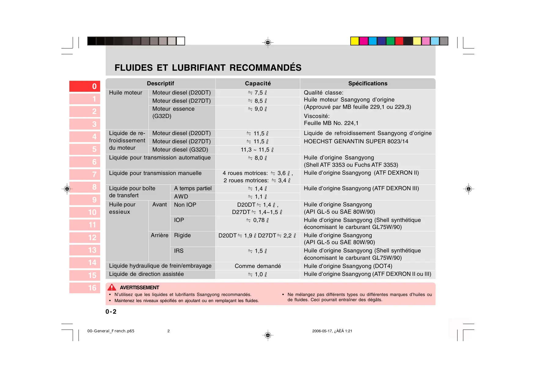 11,5 11,5 11,3 ~ 11,5 8,0 4 roues motrices: 3,6 , 2 roues motrices: 3,4 1,4 1,1 D20DT 1,4 , D27DT 1,4~1,5 0,78 D20DT 1,9 D27DT 1,5 Comme demandé 1,0 2,2 Huile d’origine Ssangyong (Shell ATF 3353 ou Fuchs ATF 3353) Huile d’origine Ssangyong (ATF DEXRON II) Huile d’origine Ssangyong (ATF DEXRON III) Huile d’origine Ssangyong (API GL-5 ou SAE 80W/90) Huile d’origine Ssangyong (Shell synthétique économisant le carburant GL75W/90) Huile d’origine Ssangyong (API GL-5 ou SAE 80W/90) Huile d’origine Ssangyong (Shell synthétique économisant le carburant GL75W/90) Huile d’origine Ssangyong (DOT4) Huile d’origine Ssangyong (ATF DEXRON II ou III) AVERTISSEMENT