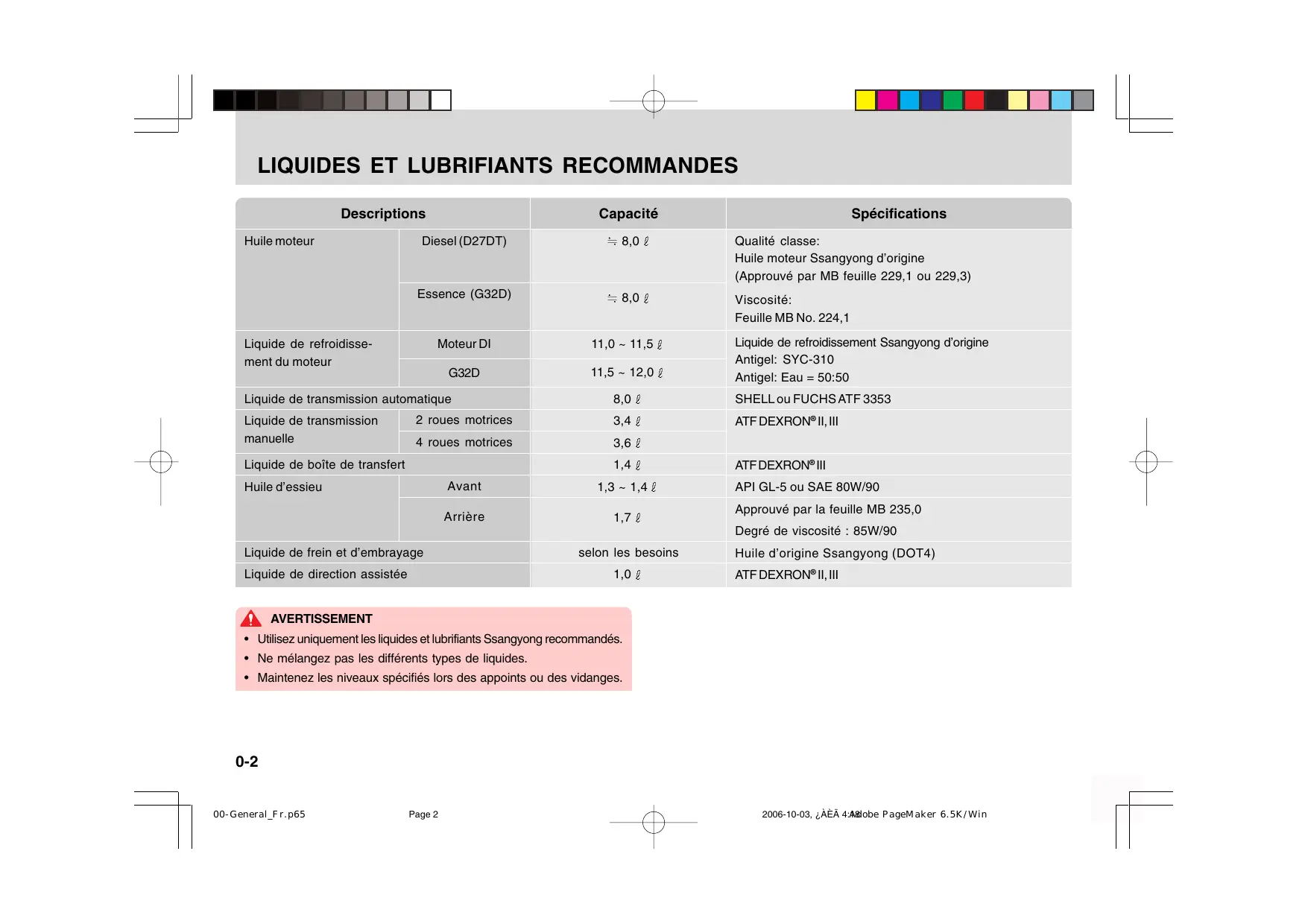 - : Une astérisque dans ce manuel signifie qu’un article d’équipement n’est pas inclus dans tous les véhicules (variantes de modèle, options de moteur, modèles propres à un pays, équipement en option, etc.). Nous voudrions signaler que les pièces et accessoires non d’origine Ssangyong n’ont été ni examinés ni approuvés par Ssangyong et en dépit d’une surveillance permanente des produit du marché, nous ne pouvons certifier ni l’adéquation ni la sécurité de tels produits qui seraient installés ou utilisés dans nos véhicules. Ssangyong ne peut être tenu pour responsable des dégâts causés par l’utilisation des pièces et d’accessoires non d’origine Ssangyong. 2006-10-03, ¿ÀÈÄ 4:18 Adobe PageMaker 6.5K/Win