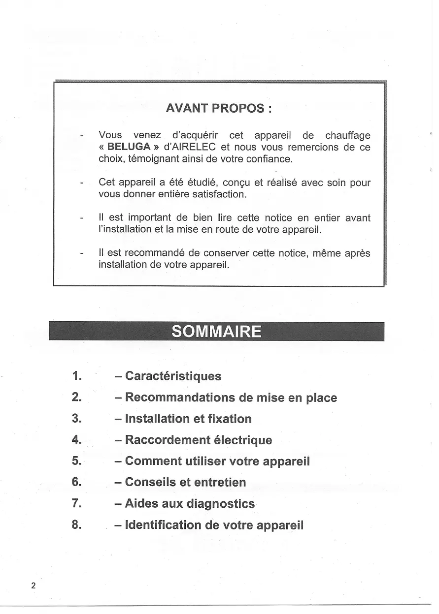 - M a n u e 'utilis a tion Installation b o n de garantie a lire attentivement ava o u t e operation et a conserver) ileA% A l RELEC AVANT P OPOS : Vous v e n e z d 'a cq u e rir c e t a p p a re il d e chauffage « BELUGA » d'AIRELEC e t nous vous remercions de ce choix, temoignant ainsi de votre confiance. Cet appareil a ete etudie, congu et realise avec soin pour vous donner entiere satisfaction. II e st important de bien lire cette notice en entier avant l'installation et la nnise en route de votre appareil. II est recommande de conserver cette notice, merne apres installation de votre appareil. SOMMAIRE