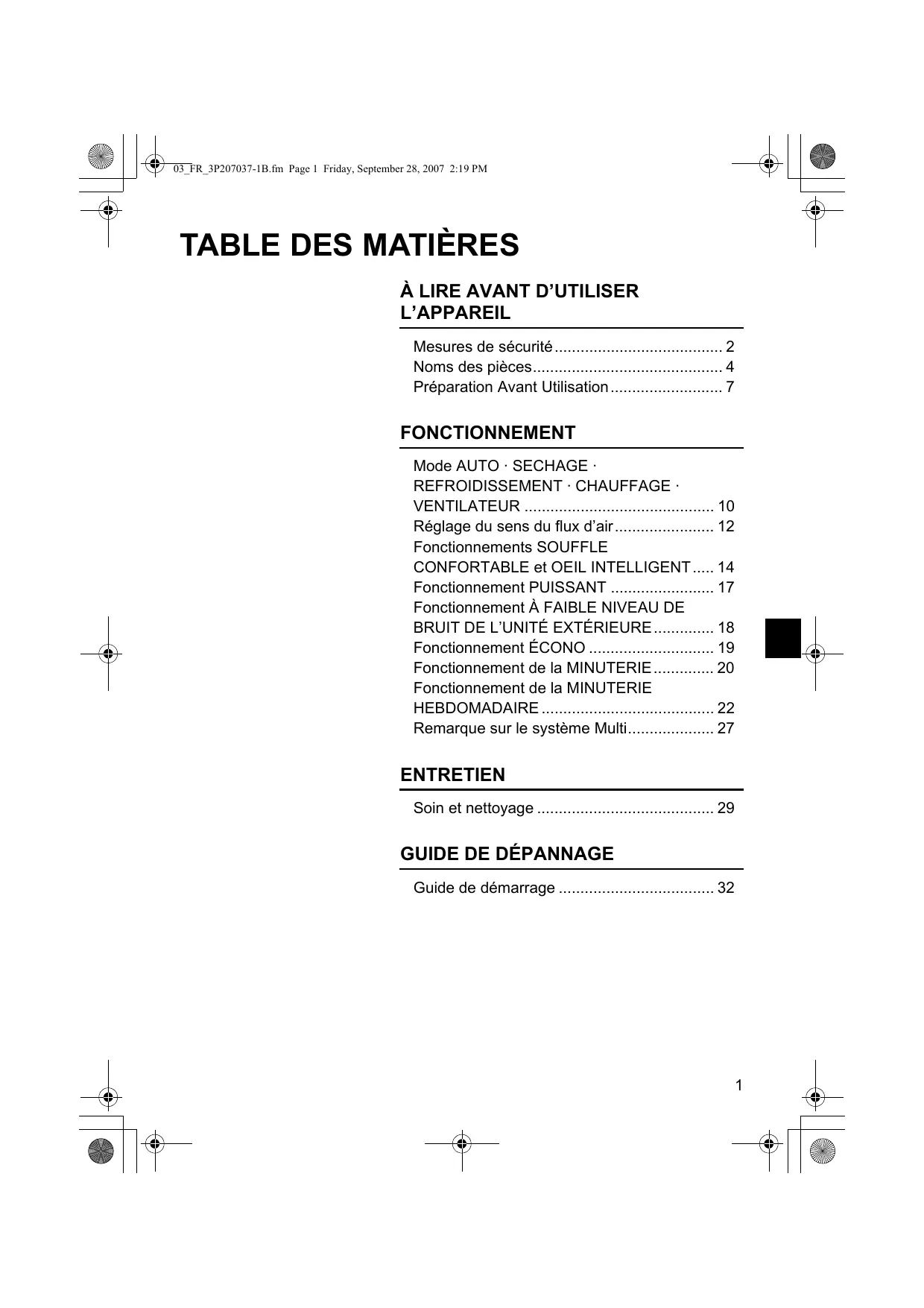 - FONCTIONNEMENT Mode AUTO · SECHAGE · REFROIDISSEMENT · CHAUFFAGE · VENTILATEUR p. 10