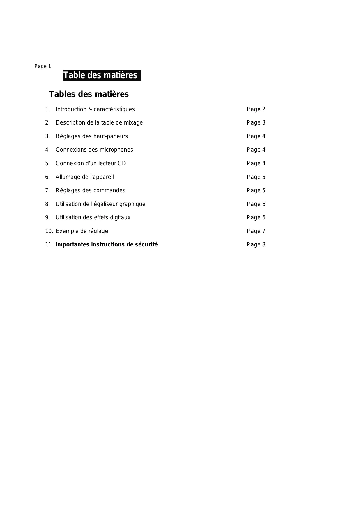 Page 1 Table des matières Tables des matières