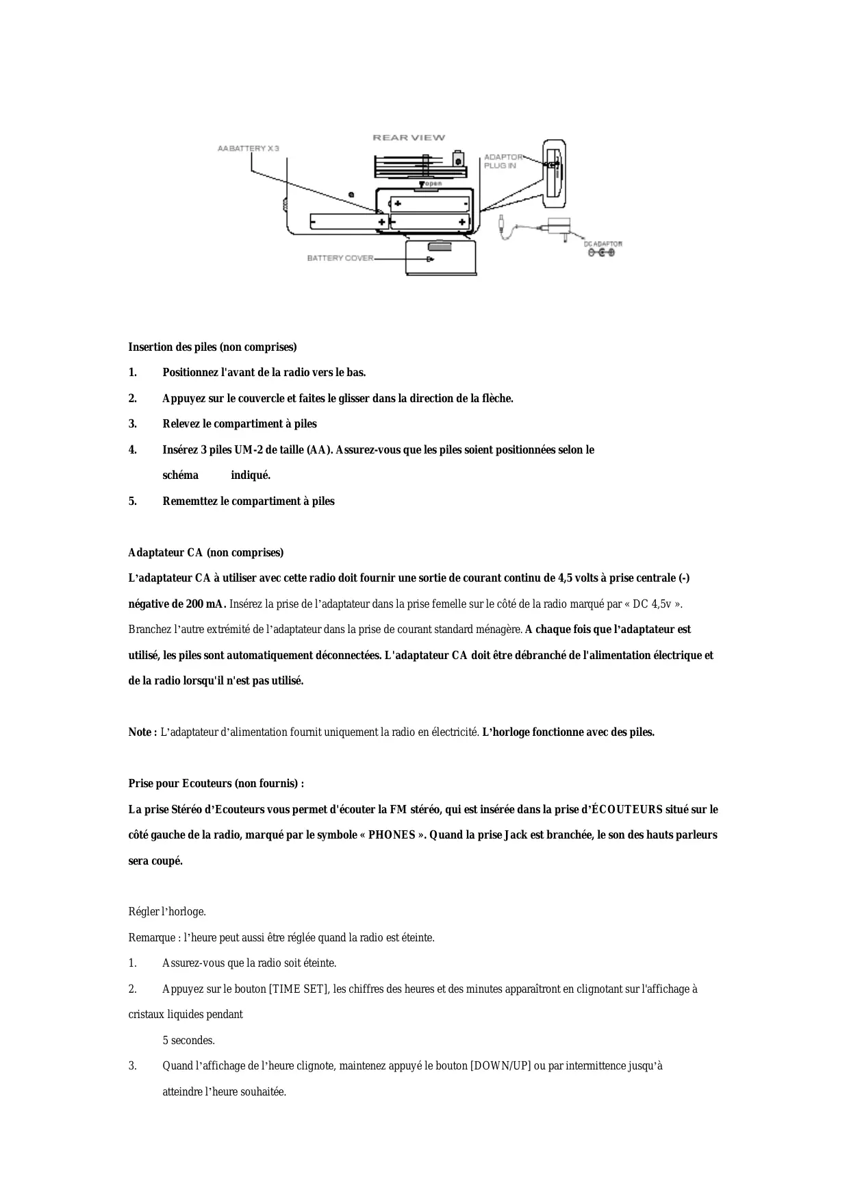 indiqué. Rememttez le compartiment à piles Adaptateur CA (non comprises) L adaptateur CA à utiliser avec cette radio doit fournir une sortie de courant continu de 4,5 volts à prise centrale (-) négative de 200 mA. Insérez la prise de l adaptateur dans la prise femelle sur le côté de la radio marqué par « DC 4,5v ». Branchez l autre extrémité de l adaptateur dans la prise de courant standard ménagère. A chaque fois que l adaptateur est utilisé, les piles sont automatiquement déconnectées. L'adaptateur CA doit être débranché de l'alimentation électrique et de la radio lorsqu'il n'est pas utilisé. Note : L adaptateur d alimentation fournit uniquement la radio en électricité. L horloge fonctionne avec des piles. Prise pour Ecouteurs (non fournis) : La prise Stéréo d Ecouteurs vous permet d'écouter la FM stéréo, qui est insérée dans la prise d ÉCOUTEURS situé sur le côté gauche de la radio, marqué par le symbole « PHONES ». Quand la prise Jack est branchée, le son des hauts parleurs sera coupé. Régler l horloge. Remarque : l heure peut aussi être réglée quand la radio est éteinte.