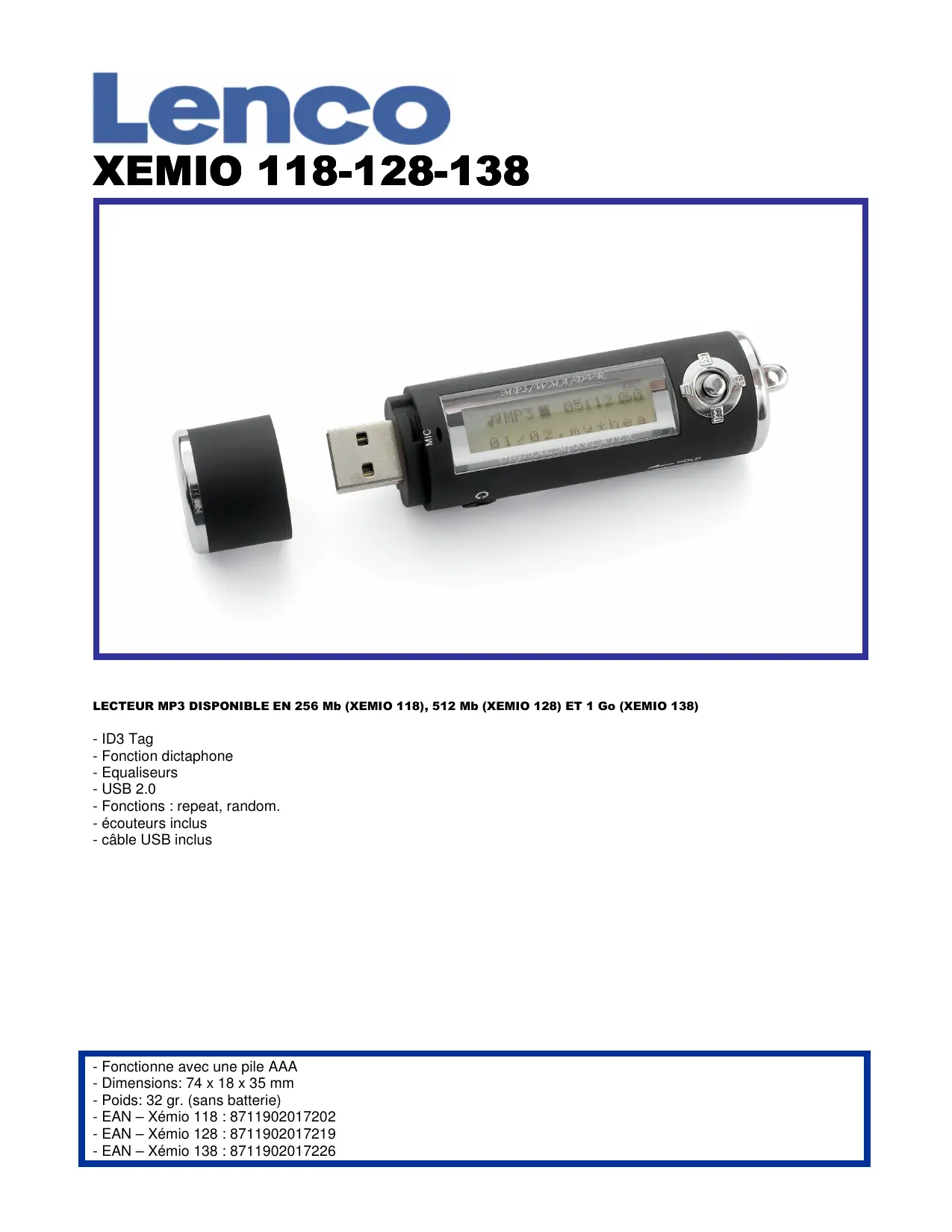 - ID3 Tag - Fonction dictaphone - Equaliseurs - USB 2.0 - Fonctions : repeat, random. - écouteurs inclus - câble USB inclus - Fonctionne avec une pile AAA - Dimensions: 74 x 18 x 35 mm - Poids: 32 gr. (sans batterie) - EAN – Xémio 118 : 8711902017202 - EAN – Xémio 128 : 8711902017219 - EAN – Xémio 138 : 8711902017226