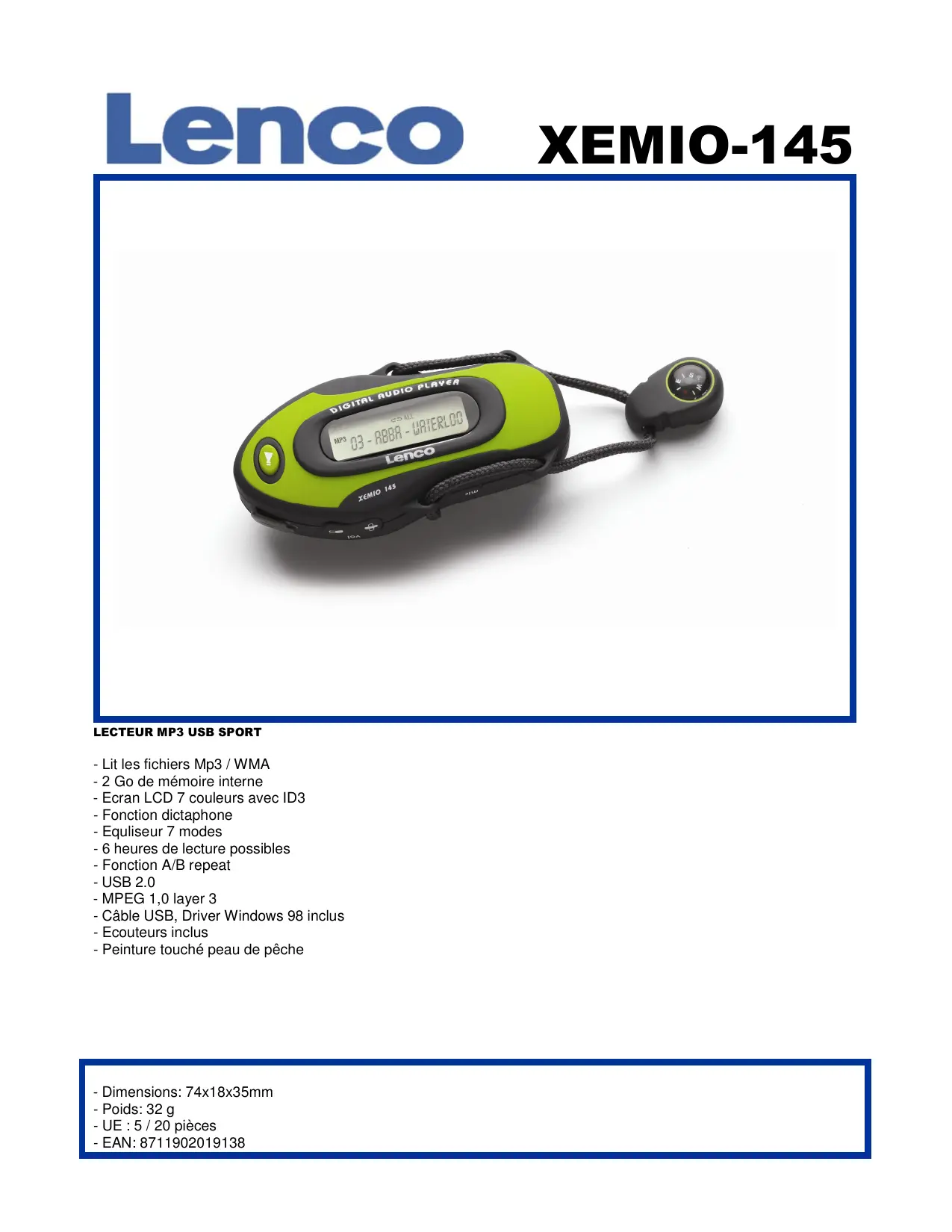 - Lit les fichiers Mp3 / WMA - 2 Go de mémoire interne - Ecran LCD 7 couleurs avec ID3 - Fonction dictaphone - Equliseur 7 modes - 6 heures de lecture possibles - Fonction A/B repeat - USB 2.0 - MPEG 1,0 layer 3 - Câble USB, Driver Windows 98 inclus - Ecouteurs inclus - Peinture touché peau de pêche - Dimensions: 74x18x35mm - Poids: 32 g - UE : 5 / 20 pièces - EAN: 8711902019138