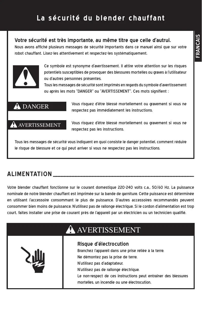 Votre blender chauffant fonctionne sur le courant domestique 220-240 volts c.a., 50/60 Hz. La puissance nominale de notre blender chauffant est imprimée sur la bande de garniture. Cette puissance est déterminée en utilisant l’accessoire consommant le plus de puissance. D’autres accessoires recommandés peuvent consommer bien moins de puissance. N’utilisez pas de rallonge électrique. Si le cordon d’alimentation est trop court, faites installer une prise de courant près de l’appareil par un électricien ou un technicien qualifié.