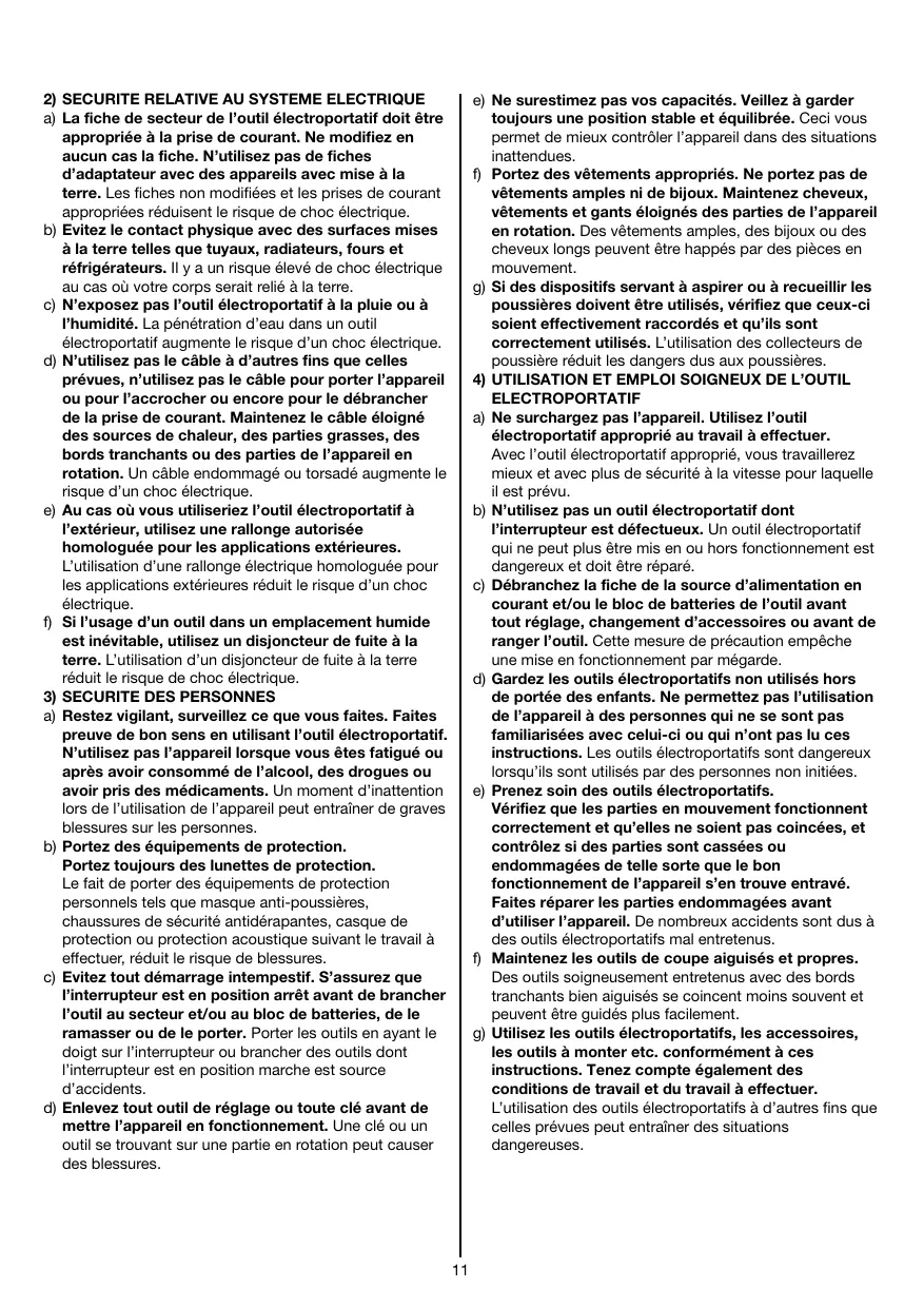 g) Utilise les outils electroportatifs, les accessoires, les outils à monter etc. conformément à ces instructions. Tenez compte également des conditions de travail et du travail à effectuer. L'utilisation des outils electroportatifs à d'autres fins que celles prévues peut entrainer des situations dangereuses.