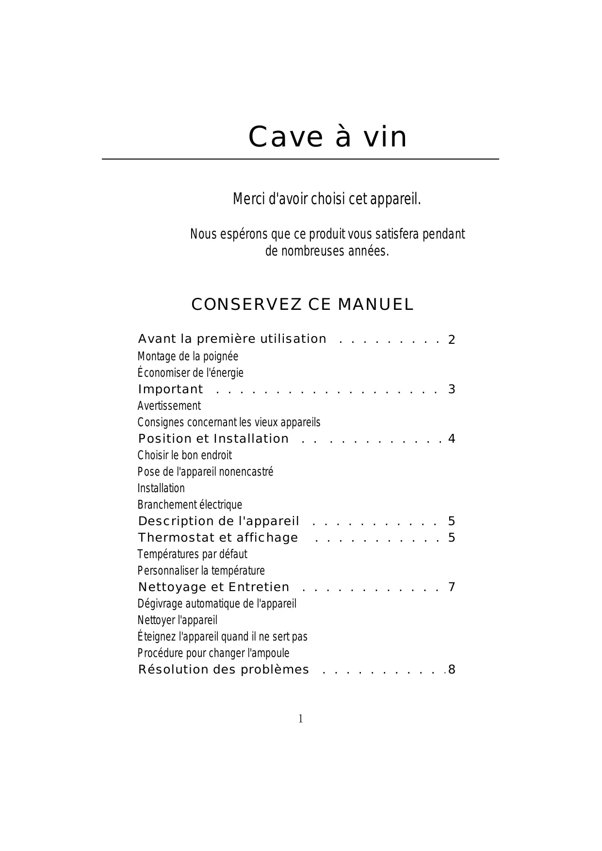 CONSERVEZ CE MANUEL Avant la première utilisation . . . . . . . . . 2 Montage de la poignée Économiser de l'énergie Important . . . . . . . . . . . . . . . . . . . 3 Avertissement Consignes concernant les vieux appareils Position et Installation . . . . . . . . . . . . 4 Choisir le bon endroit Pose de l'appareil nonencastré Installation Branchement électrique Description de l'appareil . . . . . . . . . . . 5 Thermostat et affichage . . . . . . . . . . . 5 Températures par défaut Personnaliser la température Nettoyage et Entretien . . . . . . . . . . . . 7 Dégivrage automatique de l'appareil Nettoyer l'appareil Éteignez l'appareil quand il ne sert pas Procédure pour changer l'ampoule Résolution des problèmes . . . . . . . . . . .8