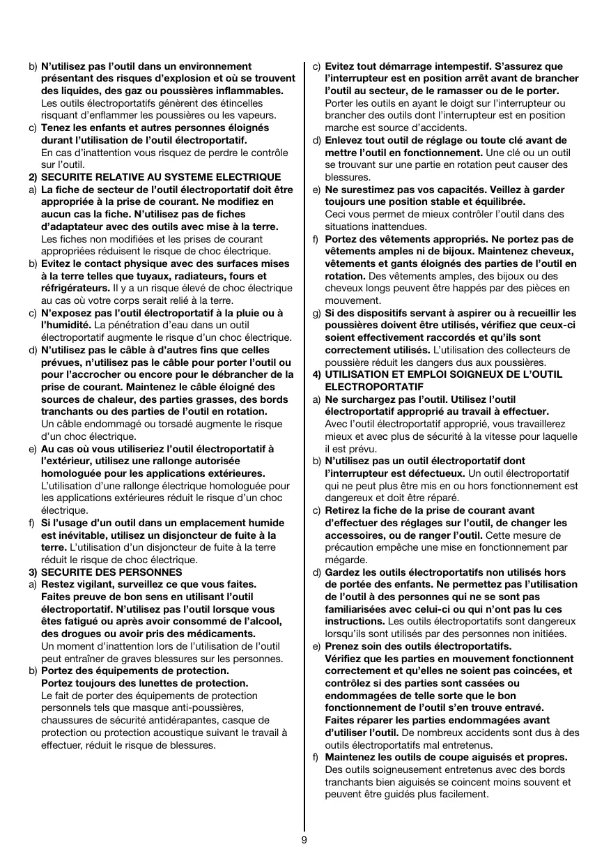 ELECTROPORTATIF a) Ne surchargez pas l’outil. Utilisez l’outil électroportatif approprié au travail à effectuer. Avec l’outil électroportatif approprié, vous travaillerez mieux et avec plus de sécurité à la vitesse pour laquelle il est prévu. b) N’utilisez pas un outil électroportatif dont l’interrupteur est défectueux. Un outil électroportatif qui ne peut plus être mis en ou hors fonctionnement est dangereux et doit être réparé. c) Retirez la fiche de la prise de courant avant d’effectuer des réglages sur l’outil, de changer les accessoires, ou de ranger l’outil. Cette mesure de précaution empêche une mise en fonctionnement par mégarde. d) Gardez les outils électroportatifs non utilisés hors de portée des enfants. Ne permettez pas l’utilisation de l’outil à des personnes qui ne se sont pas familiarisées avec celui-ci ou qui n’ont pas lu ces instructions. Les outils électroportatifs sont dangereux lorsqu’ils sont utilisés par des personnes non initiées. e) Prenez soin des outils électroportatifs. Vérifiez que les parties en mouvement fonctionnent correctement et qu’elles ne soient pas coincées, et contrôlez si des parties sont cassées ou endommagées de telle sorte que le bon fonctionnement de l’outil s’en trouve entravé. Faites réparer les parties endommagées avant d’utiliser l’outil. De nombreux accidents sont dus à des outils électroportatifs mal entretenus. f) Maintenez les outils de coupe aiguisés et propres. Des outils soigneusement entretenus avec des bords tranchants bien aiguisés se coincent moins souvent et peuvent être guidés plus facilement.