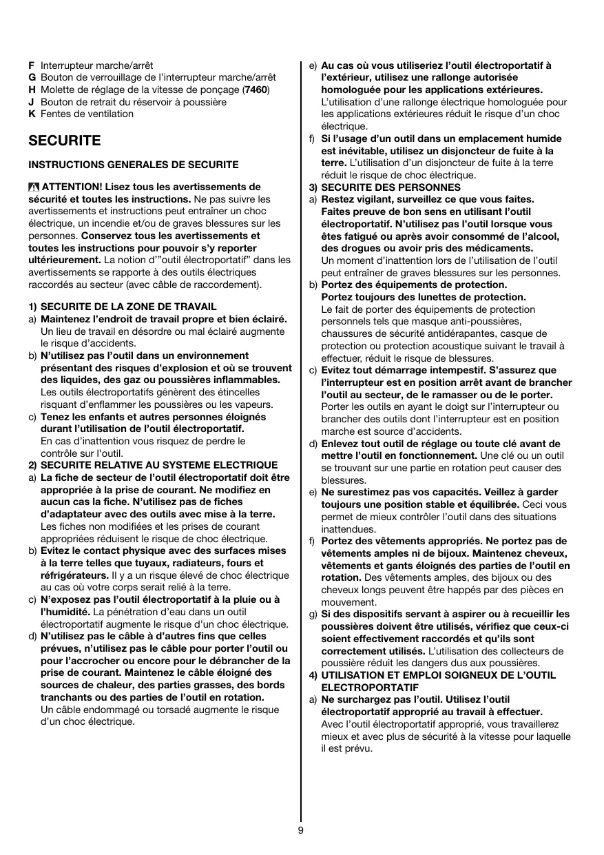 g) Utilisez les outils électroportats, les accessoires, les outils à monter etc. conformément à ces instructions en tenant compte des conditions de travail et du travail à effectuer. L'utilisation des outils électroportats à d'autres fins que celles prévues peut entrainer des situations dangereuses.