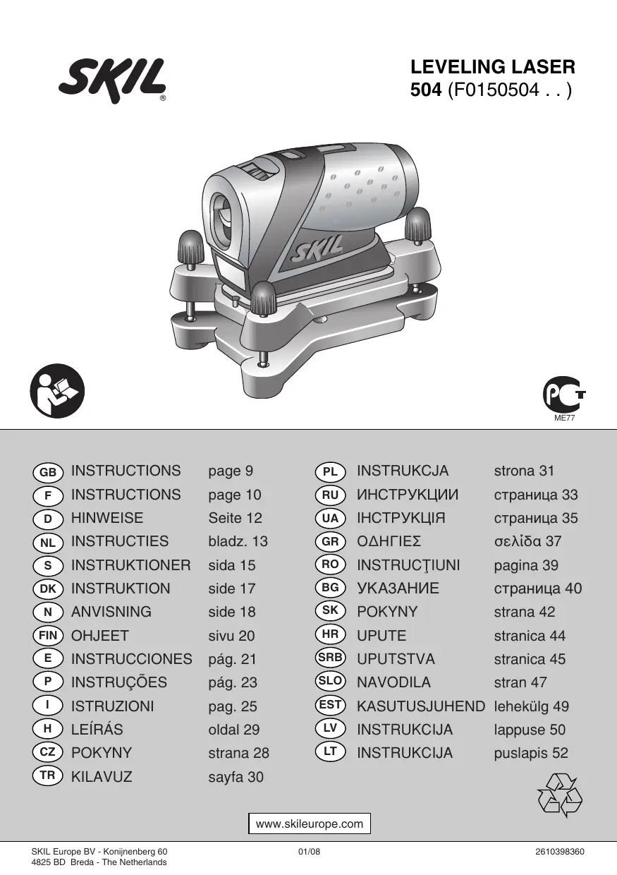 MAINTENANCE / SERVICE • Do not expose the tool to continuous vibration or extremely hot or cold temperatures • Always store the tool indoors in its protective carton/ case • Always keep the tool free of dust, moisture and direct sunlight • Clean the tool with a damp cloth ! always remove the batteries before cleaning the lens • Do not disassemble or modify the tool in any way • Do not attempt to change any part of the laser lens • If the tool should fail despite the care taken in manufacturing and testing procedures, repair should be carried out by an after-sales service centre for SKIL power tools - send the tool undismantled together with proof of purchase to your dealer or the nearest SKIL servicestation (addresses are listed on www.skileurope.com)