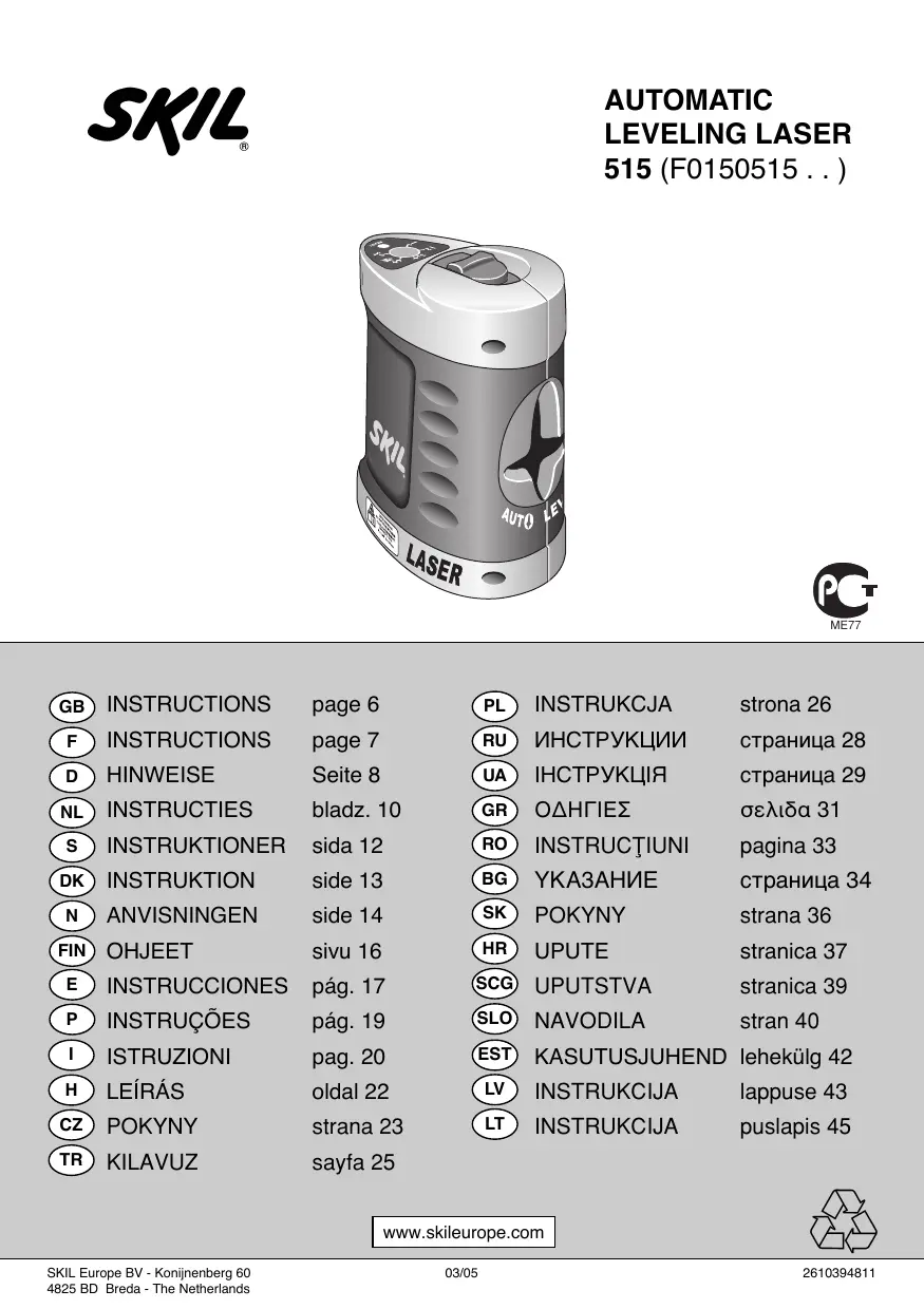 Téléchargez la notice de votre Niveau laser au format PDF gratuitement ! Retrouvez votre notice 0515 - SKIL et reprennez votre appareil électronique en main. Sur cette page sont publiés tous les documents nécessaires à l'utilisation de votre appareil 0515 de la marque SKIL.