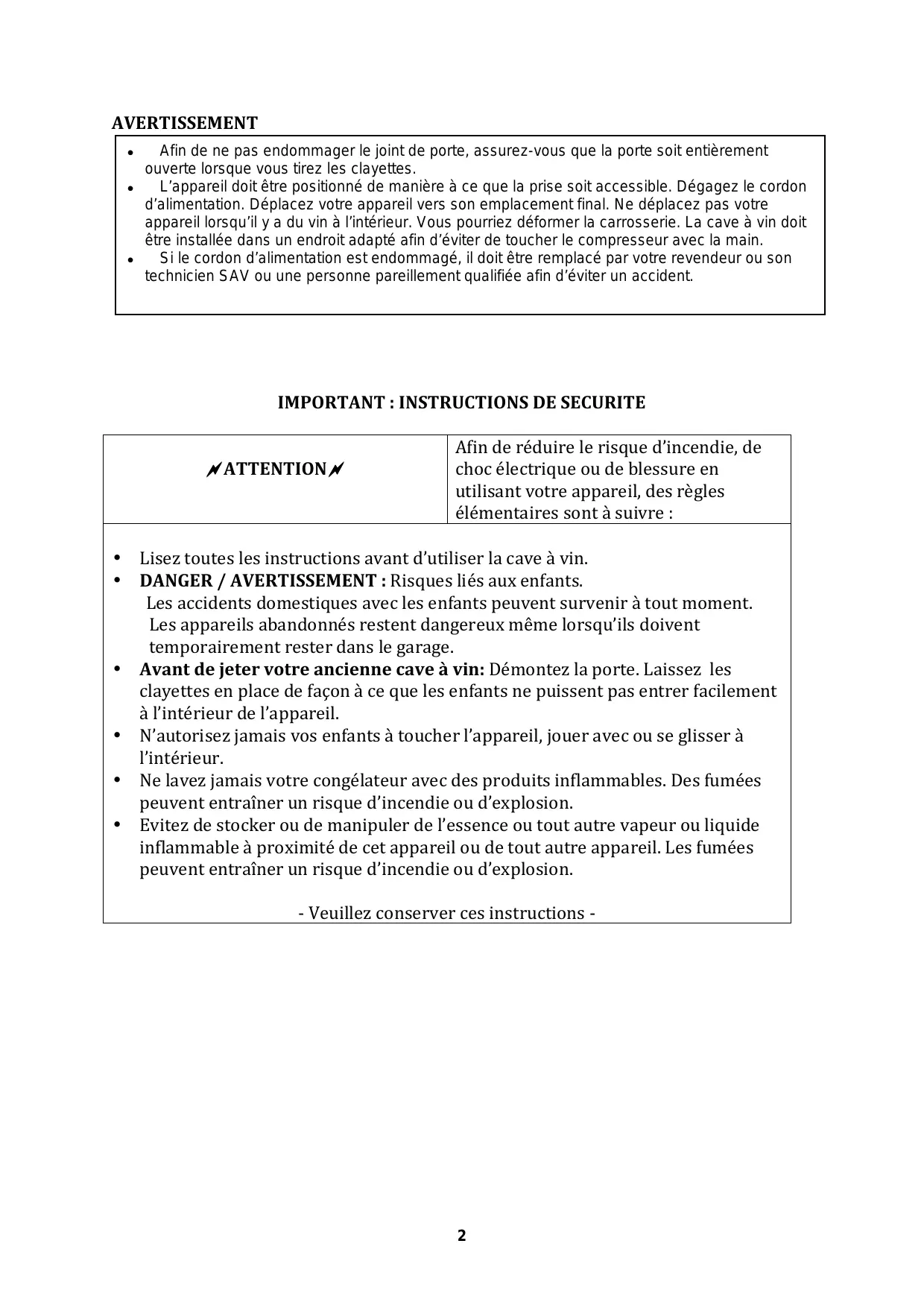 Afin de réduire le risque d’incendie, de choc électrique ou de blessure en utilisant votre appareil, des règles élémentaires sont à suivre : Lisez toutes les instructions avant d’utiliser la cave à vin. DANGER / AVERTISSEMENT : Risques liés aux enfants. Les accidents domestiques avec les enfants peuvent survenir à tout moment. Les appareils abandonnés restent dangereux même lorsqu’ils doivent temporairement rester dans le garage. Avant de jeter votre ancienne cave à vin: Démontez la porte. Laissez les clayettes en place de façon à ce que les enfants ne puissent pas entrer facilement à l’intérieur de l’appareil. N’autorisez jamais vos enfants à toucher l’appareil, jouer avec ou se glisser à l’intérieur. Ne lavez jamais votre congélateur avec des produits inflammables. Des fumées peuvent entraîner un risque d’incendie ou d’explosion. Evitez de stocker ou de manipuler de l’essence ou tout autre vapeur ou liquide inflammable à proximité de cet appareil ou de tout autre appareil. Les fumées peuvent entraîner un risque d’incendie ou d’explosion. - Veuillez conserver ces instructions -
