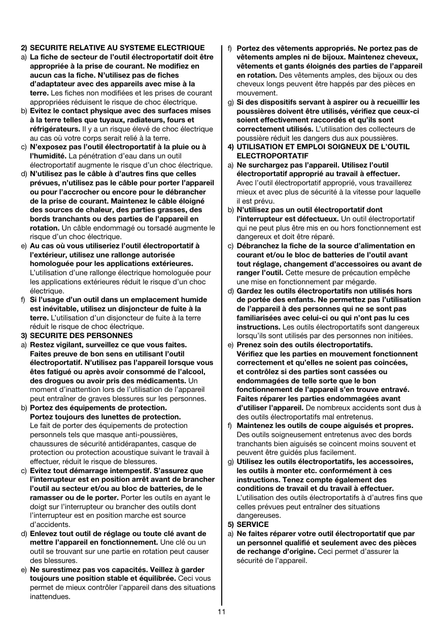 g) Utilisez les outils electroportatifs, les accessoires, les outils à monter etc. conformément à ces instructions. Tenez compte également des conditions de travail et du travail à effectuer. L'utilisation des outils electroportatifs à d'autres fins que celles prévues peut entrainer des situations dangereuses.