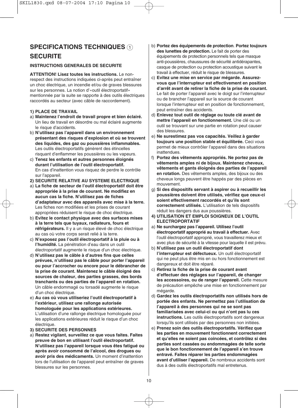 ELECTROPORTATIF a) Ne surchargez pas l’appareil. Utilisez l’outil électroportatif approprié au travail à effectuer. Avec l’outil électroportatif approprié, vous travaillerez mieux et avec plus de sécurité à la vitesse pour laquelle il est prévu. b) N’utilisez pas un outil électroportatif dont l’interrupteur est défectueux. Un outil électroportatif qui ne peut plus être mis en ou hors fonctionnement est dangereux et doit être réparé. c) Retirez la fiche de la prise de courant avant d’effectuer des réglages sur l’appareil, de changer les accessoires, ou de ranger l’appareil. Cette mesure de précaution empêche une mise en fonctionnement par mégarde. d) Gardez les outils électroportatifs non utilisés hors de portée des enfants. Ne permettez pas l’utilisation de l’appareil à des personnes qui ne se sont pas familiarisées avec celui-ci ou qui n’ont pas lu ces instructions. Les outils électroportatifs sont dangereux lorsqu’ils sont utilisés par des personnes non initiées. e) Prenez soin des outils électroportatifs. Vérifiez que les parties en mouvement fonctionnent correctement et qu’elles ne soient pas coincées, et contrôlez si des parties sont cassées ou endommagées de telle sorte que le bon fonctionnement de l’appareil s’en trouve entravé. Faites réparer les parties endommagées avant d’utiliser l’appareil. De nombreux accidents sont dus à des outils électroportatifs mal entretenus. SPECIFICATIONS TECHNIQUES 1 SECURITE