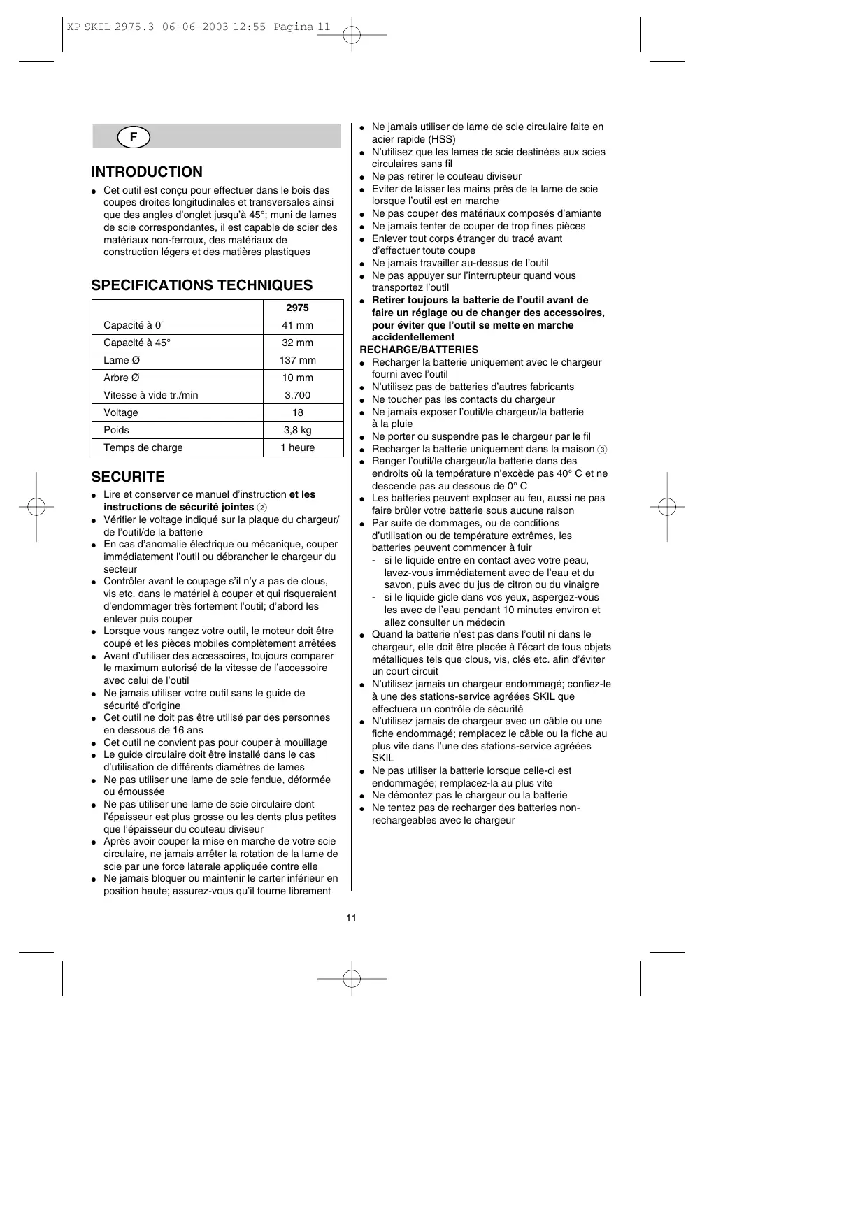 XP SKIL 2975.3 06-06-2003 12:55 Pagina 11 Ne jamais utiliser de lame de scie circulaire faite en acier rapide (HSS) ● N’utilisez que les lames de scie destinées aux scies circulaires sans fil ● Ne pas retirer le couteau diviseur ● Eviter de laisser les mains près de la lame de scie lorsque l’outil est en marche ● Ne pas couper des matériaux composés d’amiante ● Ne jamais tenter de couper de trop fines pièces ● Enlever tout corps étranger du tracé avant d’effectuer toute coupe ● Ne jamais travailler au-dessus de l’outil ● Ne pas appuyer sur l’interrupteur quand vous transportez l’outil ● Retirer toujours la batterie de l’outil avant de faire un réglage ou de changer des accessoires, pour éviter que l’outil se mette en marche accidentellement RECHARGE/BATTERIES ● Recharger la batterie uniquement avec le chargeur fourni avec l’outil ● N’utilisez pas de batteries d’autres fabricants ● Ne toucher pas les contacts du chargeur ● Ne jamais exposer l’outil/le chargeur/la batterie à la pluie ● Ne porter ou suspendre pas le chargeur par le fil ● Recharger la batterie uniquement dans la maison 3 ● Ranger l’outil/le chargeur/la batterie dans des endroits où la température n’excède pas 40° C et ne descende pas au dessous de 0° C ● Les batteries peuvent exploser au feu, aussi ne pas faire brûler votre batterie sous aucune raison ● Par suite de dommages, ou de conditions d’utilisation ou de température extrêmes, les batteries peuvent commencer à fuir - si le liquide entre en contact avec votre peau, lavez-vous immédiatement avec de l’eau et du savon, puis avec du jus de citron ou du vinaigre - si le liquide gicle dans vos yeux, aspergez-vous les avec de l’eau pendant 10 minutes environ et allez consulter un médecin ● Quand la batterie n’est pas dans l’outil ni dans le chargeur, elle doit être placée à l’écart de tous objets métalliques tels que clous, vis, clés etc. afin d’éviter un court circuit ● N’utilisez jamais un chargeur endommagé; confiez-le à une des stations-service agréées SKIL que effectuera un contrôle de sécurité ● N’utilisez jamais de chargeur avec un câble ou une fiche endommagé; remplacez le câble ou la fiche au plus vite dans l’une des stations-service agréées SKIL ● Ne pas utiliser la batterie lorsque celle-ci est endommagée; remplacez-la au plus vite ● Ne démontez pas le chargeur ou la batterie ● Ne tentez pas de recharger des batteries nonrechargeables avec le chargeur
