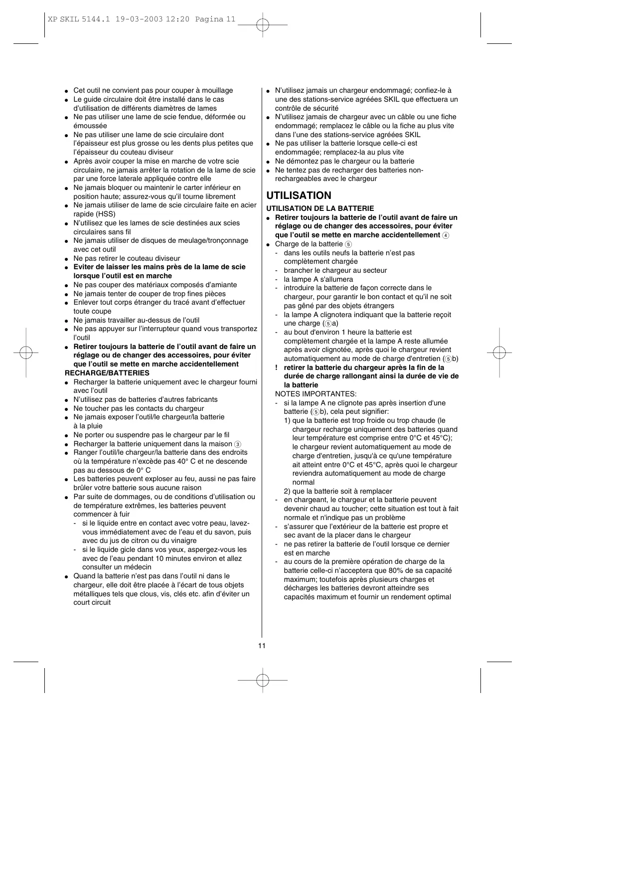 - N'utilise jamais de chargeur avec un cable ou une fiche endommage; remplaceze le cable ou la fiche au plus vite dans l'une des stations-service agregees SKIL