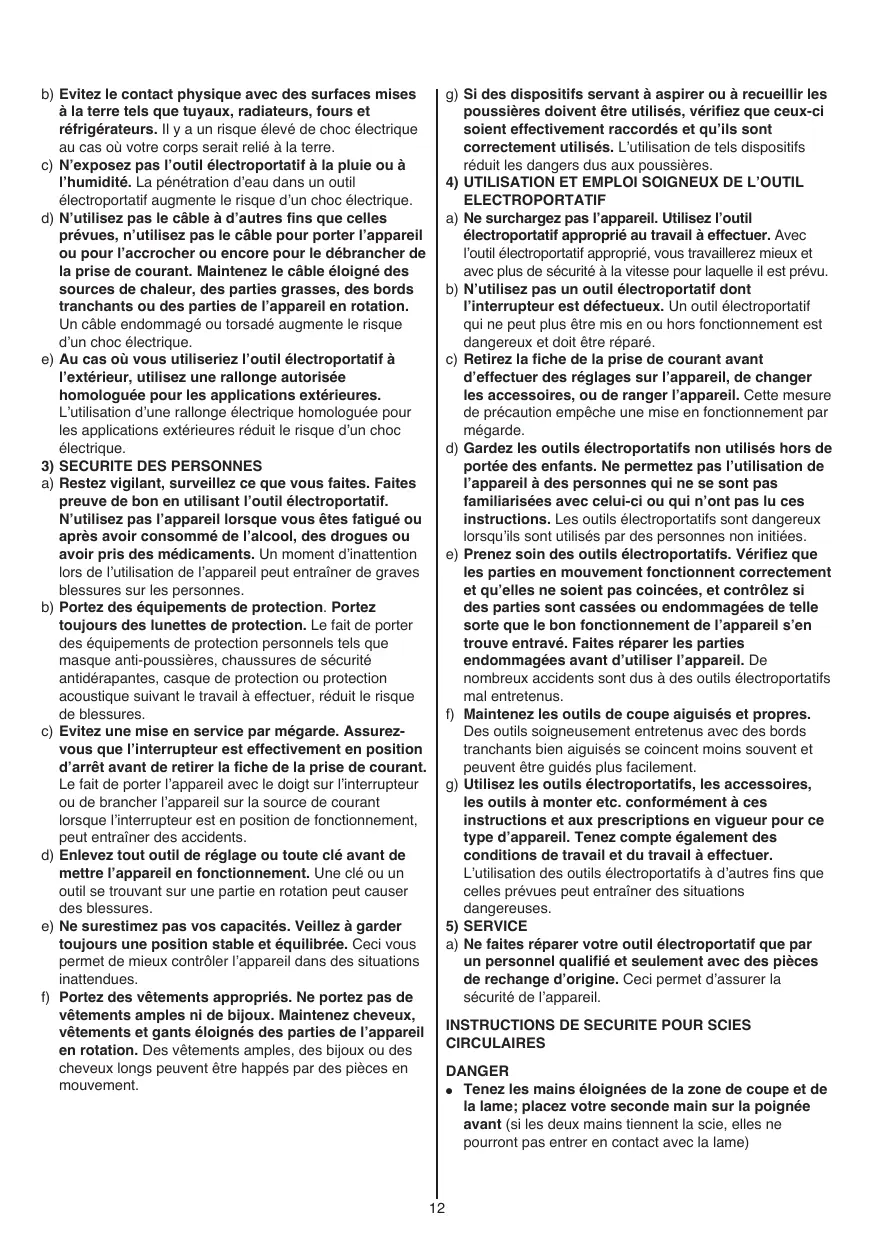 4) UTILISATION ET EMPLOI SOIGNEUX DE L’OUTIL ELECTROPORTATIF a) Ne surchargez pas l’appareil. Utilisez l’outil électroportatif approprié au travail à effectuer. Avec l’outil électroportatif approprié, vous travaillerez mieux et avec plus de sécurité à la vitesse pour laquelle il est prévu. b) N’utilisez pas un outil électroportatif dont l’interrupteur est défectueux. Un outil électroportatif qui ne peut plus être mis en ou hors fonctionnement est dangereux et doit être réparé. c) Retirez la fiche de la prise de courant avant d’effectuer des réglages sur l’appareil, de changer les accessoires, ou de ranger l’appareil. Cette mesure de précaution empêche une mise en fonctionnement par mégarde. d) Gardez les outils électroportatifs non utilisés hors de portée des enfants. Ne permettez pas l’utilisation de l’appareil à des personnes qui ne se sont pas familiarisées avec celui-ci ou qui n’ont pas lu ces instructions. Les outils électroportatifs sont dangereux lorsqu’ils sont utilisés par des personnes non initiées. e) Prenez soin des outils électroportatifs. Vérifiez que les parties en mouvement fonctionnent correctement et qu’elles ne soient pas coincées, et contrôlez si des parties sont cassées ou endommagées de telle sorte que le bon fonctionnement de l’appareil s’en trouve entravé. Faites réparer les parties endommagées avant d’utiliser l’appareil. De nombreux accidents sont dus à des outils électroportatifs mal entretenus. f) Maintenez les outils de coupe aiguisés et propres. Des outils soigneusement entretenus avec des bords tranchants bien aiguisés se coincent moins souvent et peuvent être guidés plus facilement. g) Utilisez les outils électroportatifs, les accessoires, les outils à monter etc. conformément à ces instructions et aux prescriptions en vigueur pour ce type d’appareil. Tenez compte également des conditions de travail et du travail à effectuer. L’utilisation des outils électroportatifs à d’autres fins que celles prévues peut entraîner des situations dangereuses. 5) SERVICE a) Ne faites réparer votre outil électroportatif que par un personnel qualifié et seulement avec des pièces de rechange d’origine. Ceci permet d’assurer la sécurité de l’appareil. INSTRUCTIONS DE SECURITE POUR SCIES CIRCULAIRES DANGER ● Tenez les mains éloignées de la zone de coupe et de la lame; placez votre seconde main sur la poignée avant (si les deux mains tiennent la scie, elles ne pourront pas entrer en contact avec la lame)