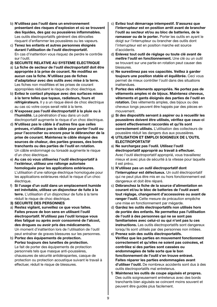 b) N'utilise pas l'outil dans un environnement prsentant des risques d'explosion et ou se trouvent des liquides, des gaz ou poussieres inflammables. Les outils electrolyportatifs générent des étin celles risquant d'enflammier les poussières ou les vapeurs.