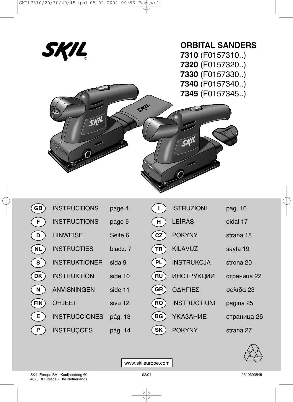 Garder toujours votre outil et le câble propres (spécialement les aérations) - eliminer les poussières de ponçage qui adhèrent à l'outil avec un pinceau ! débrancher la fiche avant le nettoyage Ce produit SKIL est garanti conformément aux dispositions légales/nationales; tout dommage dû à l’usure normale, à une surcharge ou à une mauvaise utilisation de l’outil, sera exclu de la garantie En cas de problème, vous devez retourner l’outil non démonté au vendeur ou à la station-service SKIL la plus proche, en joignant la preuve d’achat (les adresses ainsi que la vue éclatée de l’outil figurent sur www.skileurope.com) Débarrassez-vous de l’outil en triant outil, accessoires et emballage en vue du recyclage propice à l’environnement (les éléments plastiques sont étiquetés en vue du recyclage catégorisé)