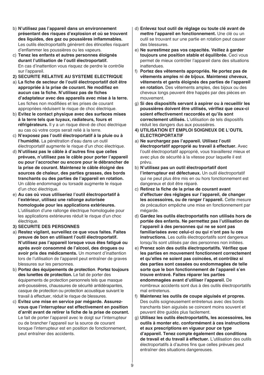 b) N’utilisez pas l’appareil dans un environnement présentant des risques d’explosion et où se trouvent des liquides, des gaz ou poussières inflammables. Les outils électroportatifs génèrent des étincelles risquant d’enflammer les poussières ou les vapeurs. c) Tenez les enfants et autres personnes éloignés durant l’utilisation de l’outil électroportatif. En cas d’inattention vous risquez de perdre le contrôle sur l’appareil.