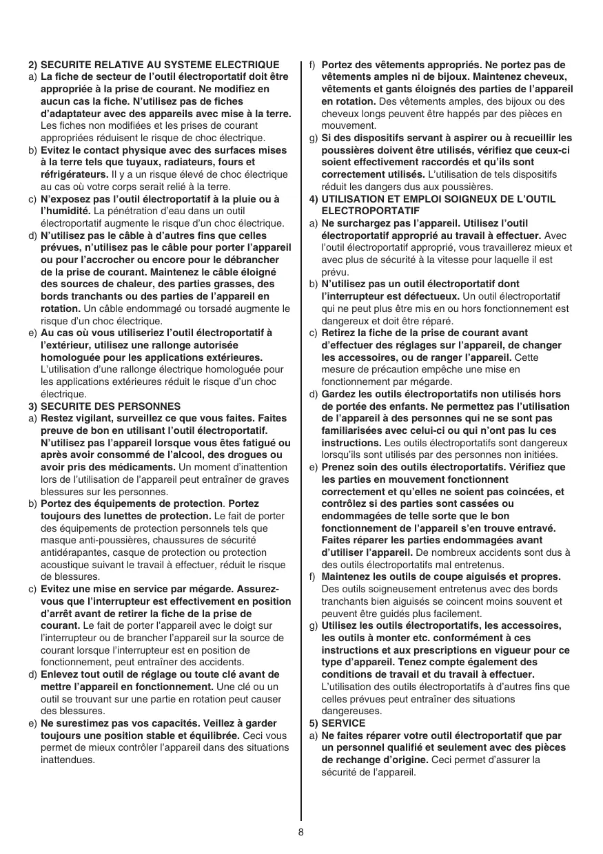 g) Utilisez les outils electroportatifs, les accessoires, les outils à monter etc. conformément à ces instructions et aux prescriptions en vigueur pour ce type d'appareil. Tenez compte également des conditions de travail et du travail à effectuer. L'utilisation des outils electroportatifs à d'autres fins que celles prévues peut entrainer des situations dangereuses.