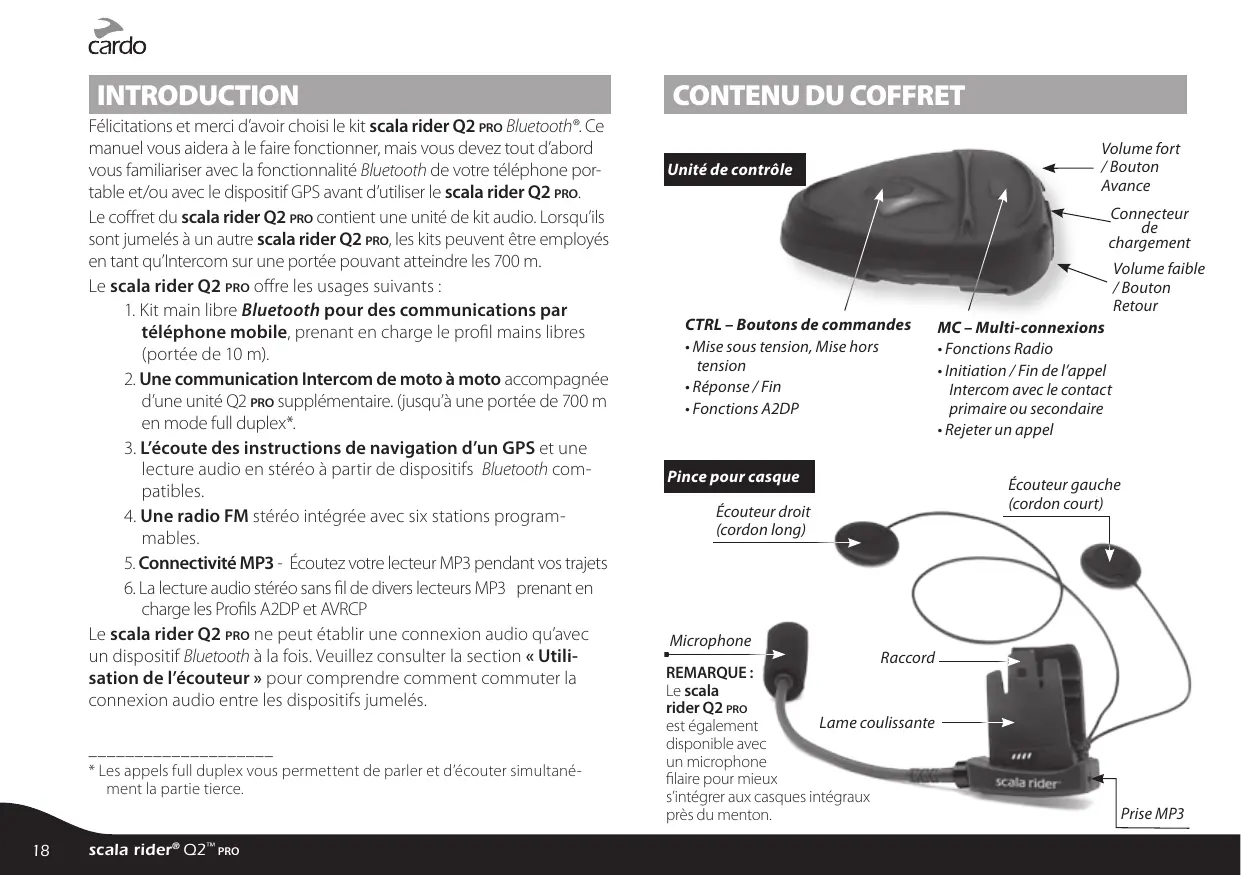 Câble MP3 Support pour câble MP3 La plaque adhésive Lingette humide Étui portable Bonnettes pour microphones Une bonnette plate pour les casques intégraux et une bonnette ronde pour les autres types de casques. Guide d’utilisation y compris les formulaires de garantie et d’inscription Téléphone mobile et connectivité A2DP Radio FM intégrée GPS lecteur MP3 Français Clé Allen Coussinets en velcro Intercom bidirectionnelle Pilote-Passager Kit de la famille scala rider Q2 pro ou autre scala rider Intercom moto à moto jusqu’á 700 mètres IMPORTANT : Votre kit mains libres est résistant à l’eau et à la poussière. La languette de couverture protégeant le connecteur de chargement restera hermétiquement fermée pour empêcher la moisissure de pénétrer dans l’appareil.