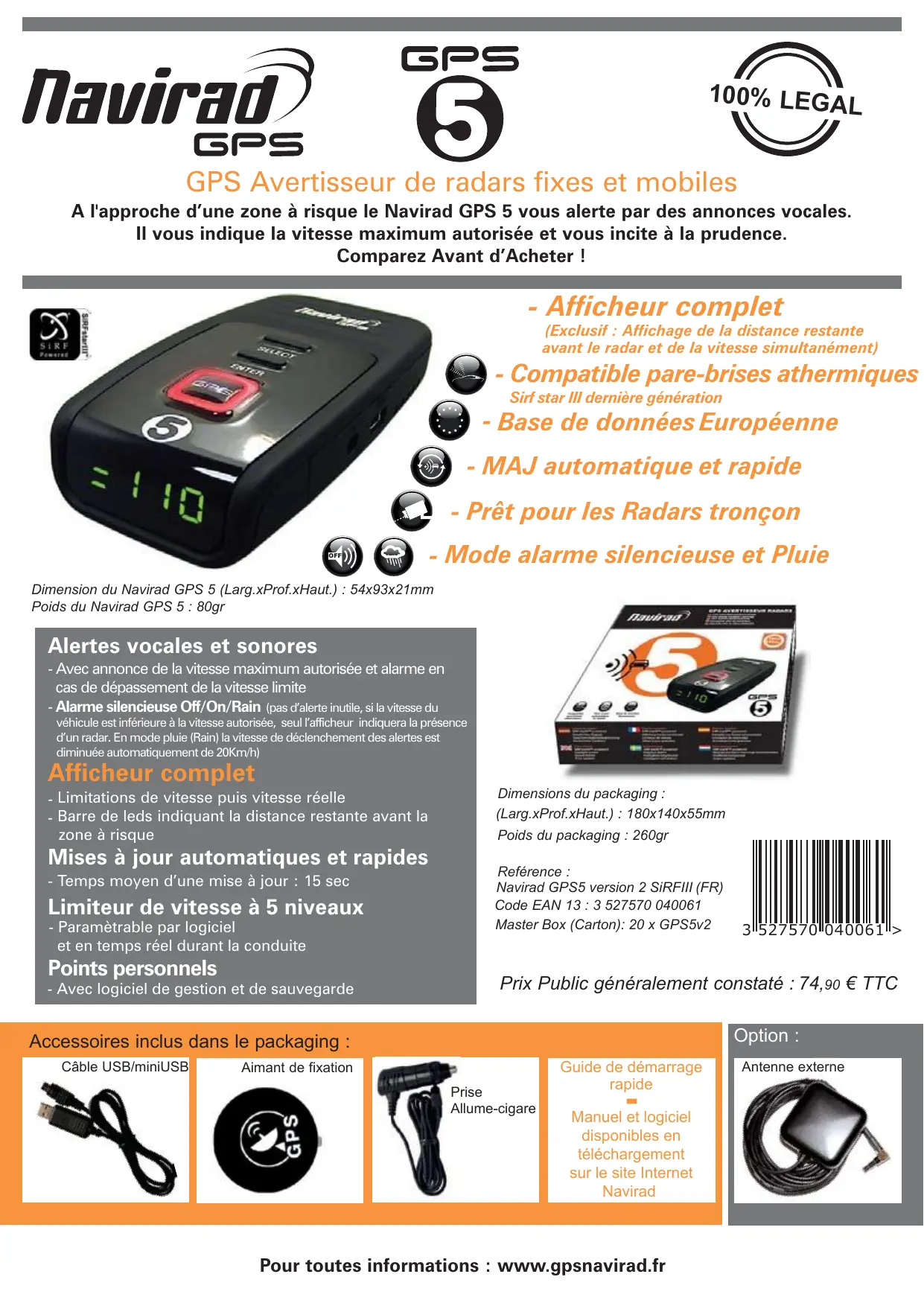 100% LEGAL GPS Avertisseur de radars fixes et mobiles A l'approche d’une zone à risque le Navirad GPS 5 vous alerte par des annonces vocales. Il vous indique la vitesse maximum autorisée et vous incite à la prudence. Comparez Avant d’Acheter ! - Afficheur complet (Exclusif : Affichage de la distance restante avant le radar et de la vitesse simultanément) - Compatible pare-brises athermiques Sirf star III dernière génération - Base de données Européenne - MAJ automatique et rapide - Prêt pour les Radars tronçon OFF - Mode alarme silencieuse et Pluie Dimension du Navirad GPS 5 (Larg.xProf.xHaut.) : 54x93x21mm Poids du Navirad GPS 5 : 80gr Alertes vocales et sonores - Avec annonce de la vitesse maximum autorisée et alarme en cas de dépassement de la vitesse limite - Alarme silencieuse Off/On/Rain (pas d’alerte inutile, si la vitesse du véhicule est inférieure à la vitesse autorisée, seul l’afficheur indiquera la présence d’un radar. En mode pluie (Rain) la vitesse de déclenchement des alertes est diminuée automatiquement de 20Km/h) Afficheur complet - Limitations de vitesse puis vitesse réelle - Barre de leds indiquant la distance restante avant la zone à risque Mises à jour automatiques et rapides - Temps moyen d’une mise à jour : 15 sec Limiteur de vitesse à 5 niveaux - Paramètrable par logiciel et en temps réel durant la conduite Points personnels - Avec logiciel de gestion et de sauvegarde Dimensions du packaging : (Larg.xProf.xHaut.) : 180x140x55mm Poids du packaging : 260gr Reférence : Navirad GPS5 version 2 SiRFIII (FR) Code EAN 13 : 3 527570 040061 Master Box (Carton): 20 x GPS5v2 Prix Public généralement constaté : 74,90 € TTC Option : Accessoires inclus dans le packaging : Câble USB/miniUSB 3 527570 040061 > Aimant de fixation Prise Allume-cigare Guide de démarrage rapide