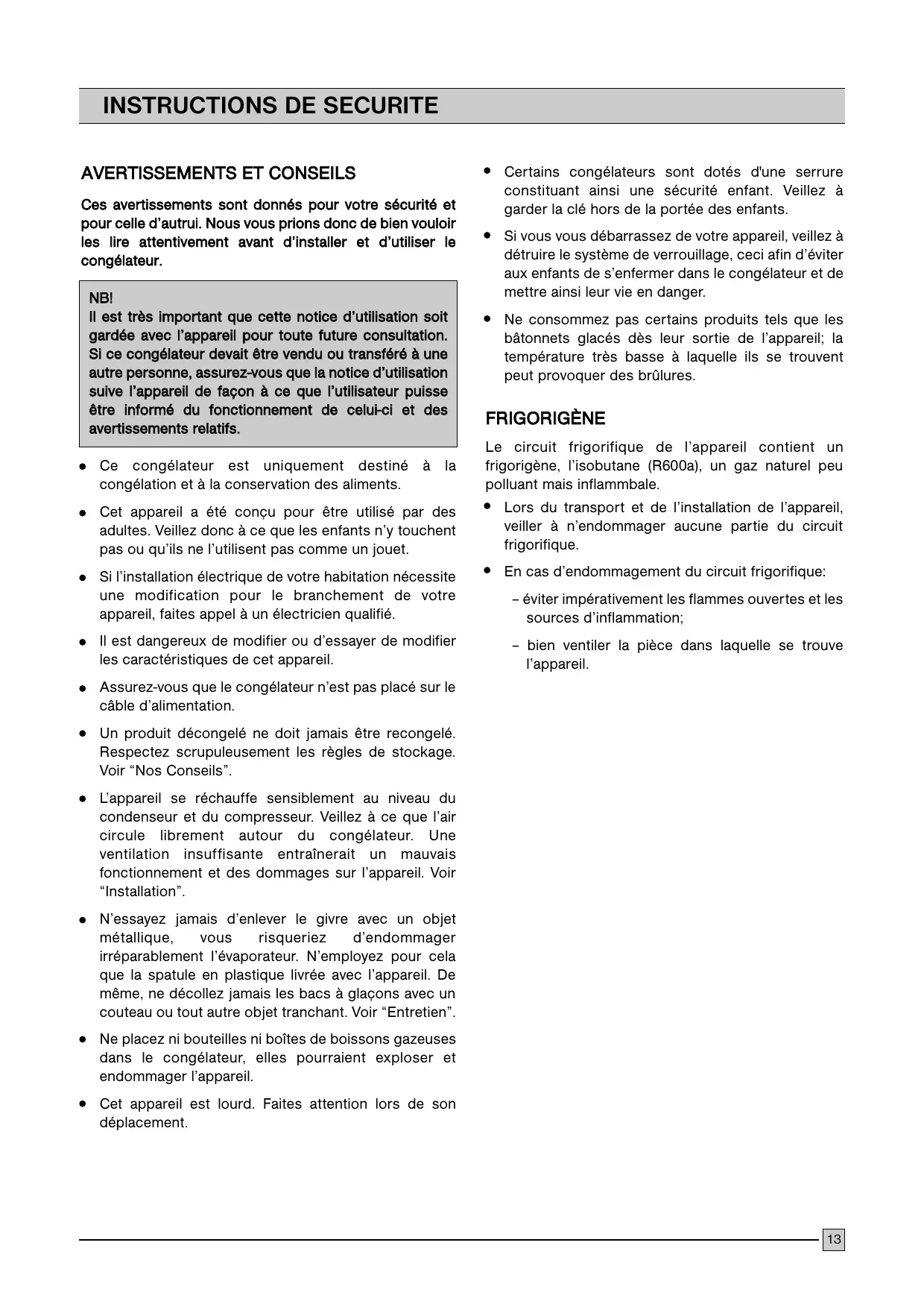 Ces avertissements sont donnés pour votre sécurité et pour celle dautrui. Nous vous prions donc de bien vouloir les lire attentivement avant dinstaller et dutiliser le congélateur. NB! Il est très important que cette notice dutilisation soit gardée avec lappareil pour toute future consultation. Si ce congélateur devait être vendu ou transféré à une autre personne, assurez-vous que la notice dutilisation suive lappareil de façon à ce que lutilisateur puisse être informé du fonctionnement de celui-ci et des avertissements relatifs. Ce congélateur est uniquement destiné à la congélation et à la conservation des aliments. Cet appareil a été conçu pour être utilisé par des adultes. Veillez donc à ce que les enfants ny touchent pas ou quils ne lutilisent pas comme un jouet. Si linstallation électrique de votre habitation nécessite une modification pour le branchement de votre appareil, faites appel à un électricien qualifié. Il est dangereux de modifier ou dessayer de modifier les caractéristiques de cet appareil. Certains congélateurs sont dotés d'une serrure constituant ainsi une sécurité enfant. Veillez à garder la clé hors de la portée des enfants. Si vous vous débarrassez de votre appareil, veillez à détruire le système de verrouillage, ceci afin déviter aux enfants de senfermer dans le congélateur et de mettre ainsi leur vie en danger. Ne consommez pas certains produits tels que les bâtonnets glacés dès leur sortie de lappareil; la température très basse à laquelle ils se trouvent peut provoquer des brûlures. FRIGORIGÈNE Le circuit frigorifique de lappareil contient un frigorigène, lisobutane (R600a), un gaz naturel peu polluant mais inflammbale. Lors du transport et de linstallation de lappareil, veiller à nendommager aucune partie du circuit frigorifique. En cas dendommagement du circuit frigorifique: éviter impérativement les flammes ouvertes et les sources dinflammation; bien ventiler la pièce dans laquelle se trouve lappareil. Assurez-vous que le congélateur nest pas placé sur le câble dalimentation. Un produit décongelé ne doit jamais être recongelé. Respectez scrupuleusement les règles de stockage. Voir Nos Conseils. Lappareil se réchauffe sensiblement au niveau du condenseur et du compresseur. Veillez à ce que lair circule librement autour du congélateur. Une ventilation insuffisante entraînerait un mauvais fonctionnement et des dommages sur lappareil. Voir Installation. Nessayez jamais denlever le givre avec un objet métallique, vous risqueriez dendommager irréparablement lévaporateur. Nemployez pour cela que la spatule en plastique livrée avec lappareil. De même, ne décollez jamais les bacs à glaçons avec un couteau ou tout autre objet tranchant. Voir Entretien. Ne placez ni bouteilles ni boîtes de boissons gazeuses dans le congélateur, elles pourraient exploser et endommager lappareil. Cet appareil est lourd. Faites attention lors de son déplacement.