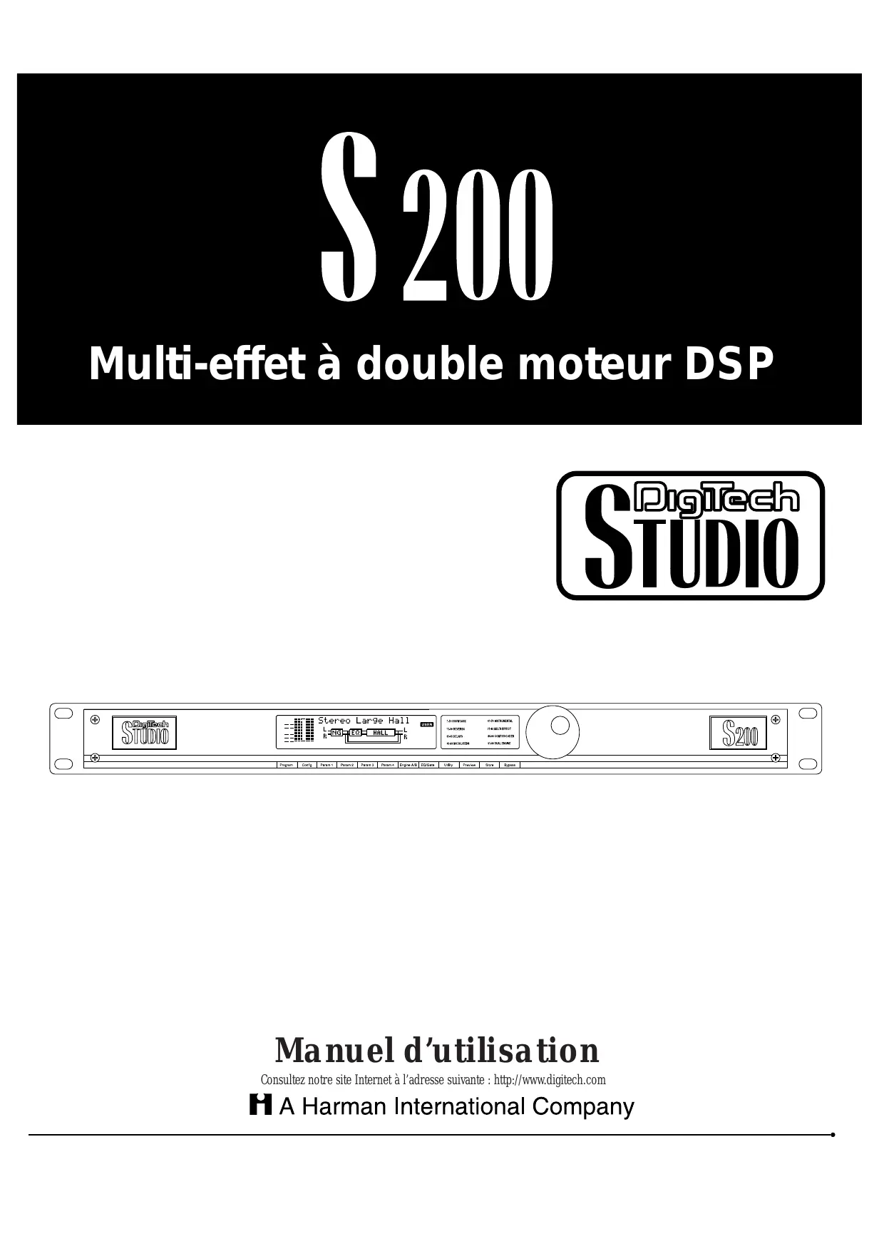 Delay Stereo 1 Seconde 120 bpm à la noire 150 bpm à la noire 200 bpm à la noire Karaoke Room Panning Delay Live Vocal Delay Delay Loop 2 Secondes Tape Delay KTV Lounge Phasing gauche - Pitch droite Split Délai gauche - Gated Reverb sommation doite Room Delay 2 Tap Short Plate - Hall sommation doite Panner gauche - Compresseur sommation doite Reverse Reverb gauche - Modulateur en anneau droit, split Slap Delay gauche - Room Reverb droit, split Octave sup. gauche - Octave inf. sommation doite Fast Phase gauche - Arena Reverb droit, split Manuel d’utilisation 8760 South Sandy Parkway Sandy, Utah, 84070 Téléphone : 801.566.8919 FAX : 801.566.7005 Distribution internationale : 3 Overlook Drive, Unit 4 Amherst, New Hampshire 03031 U.S.A. FAX : 603.672.4246 Digitech Studio™ et S-200™sont des marques déposées de Harman Music Group Incorporated Copyright © 1998 the Harman Music Group Incorporated Consultez notre site Internet à l’adresse suivante : http://www.digitech.com