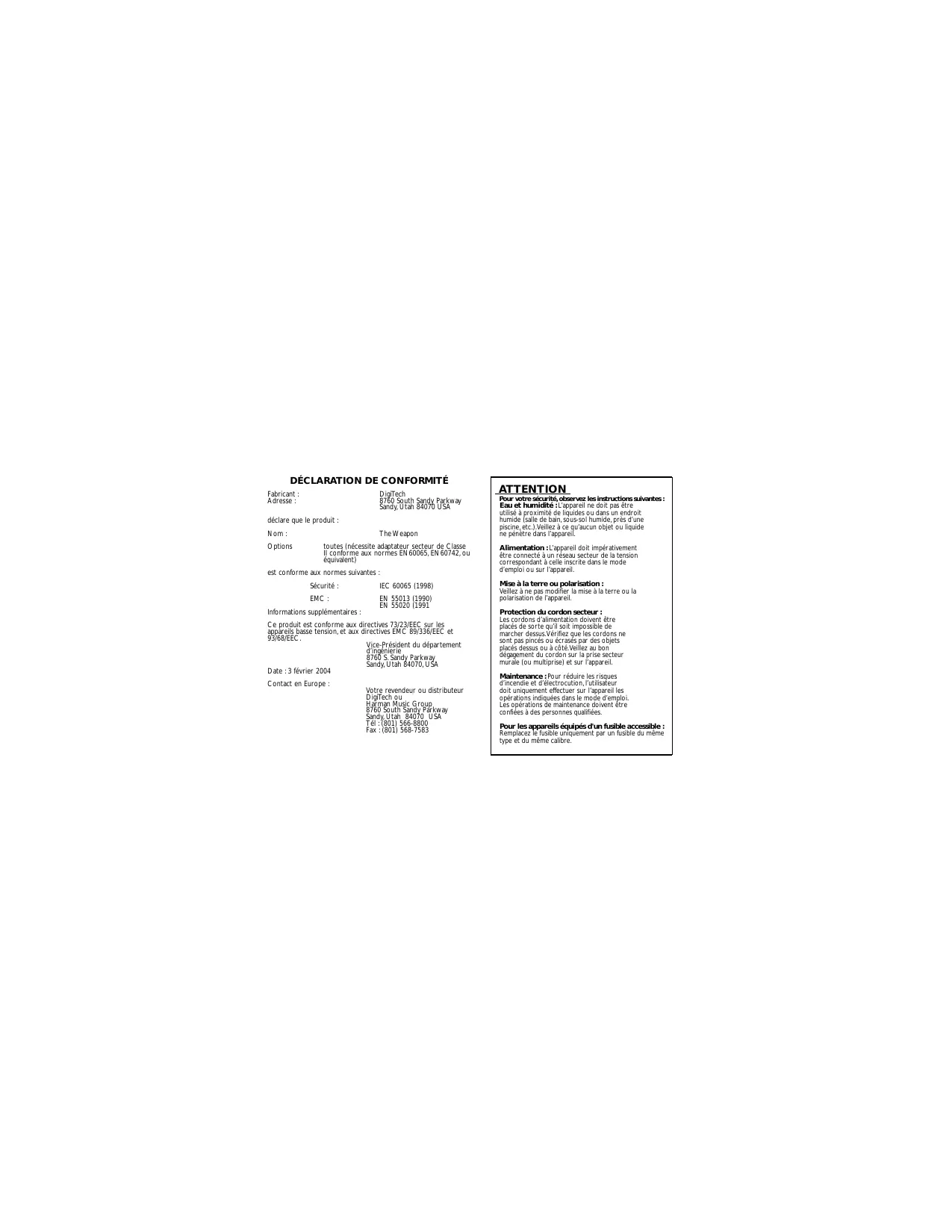Fabricant : Adresse : DigiTech 8760 South Sandy Parkway Sandy, Utah 84070 USA déclare que le produit : Nom : Options The Weapon toutes (nécessite adaptateur secteur de Classe II conforme aux normes EN60065, EN60742, ou équivalent) est conforme aux normes suivantes : Sécurité : IEC 60065 (1998) EMC : EN 55013 (1990) EN 55020 (1991 Informations supplémentaires : Ce produit est conforme aux directives 73/23/EEC sur les appareils basse tension, et aux directives EMC 89/336/EEC et 93/68/EEC. Vice-Président du département d’ingénierie 8760 S. Sandy Parkway Sandy, Utah 84070, USA Date : 3 février 2004 Contact en Europe : Votre revendeur ou distributeur DigiTech ou Harman Music Group 8760 South Sandy Parkway Sandy, Utah 84070 USA Tél : (801) 566-8800 Fax : (801) 568-7583 ATTENTION Pour votre sécurité, observez les instructions suivantes : Eau et humidité : L’appareil ne doit pas être utilisé à proximité de liquides ou dans un endroit humide (salle de bain, sous-sol humide, près d’une piscine, etc.). Veillez à ce qu’aucun objet ou liquide ne pénètre dans l’appareil. Alimentation : L’appareil doit impérativement être connecté à un réseau secteur de la tension correspondant à celle inscrite dans le mode d’emploi ou sur l’appareil. Mise à la terre ou polarisation : Veillez à ne pas modifier la mise à la terre ou la polarisation de l’appareil. Protection du cordon secteur : Les cordons d’alimentation doivent être placés de sorte qu’il soit impossible de marcher dessus. Vérifiez que les cordons ne sont pas pincés ou écrasés par des objets placés dessus ou à côté. Veillez au bon dégagement du cordon sur la prise secteur murale (ou multiprise) et sur l’appareil. Maintenance : Pour réduire les risques d’incendie et d’électrocution, l’utilisateur doit uniquement effectuer sur l’appareil les opérations indiquées dans le mode d’emploi. Les opérations de maintenance doivent être confiées à des personnes qualifiées. Pour les appareils équipés d'un fusible accessible : Remplacez le fusible uniquement par un fusible du même type et du même calibre. Garantie Nous sommes très fiers des produits que nous fabriquons. C’est pourquoi DigiTech garantit ses produits. Garantie : Les termes de la garantie et les dommages couverts dépendent du pays de distribution du produit. Nous vous conseillons de consulter votre revendeur ou l’importateur agréé de votre pays. REMARQUE : Les informations contenues dans ce mode d’emploi sont susceptibles d’être modifiées sans préavis. Certaines informations relatives au produit ou au système d’exploitation peuvent donc s’avérer inexactes au moment de l’impression de ce mode d’emploi. Les informations contenues dans cette version du mode d’emploi annulent et remplacent toutes les précédentes. Les produits DigiTech® sont depuis longtemps les processeurs d’effets de choix de nombreux musiciens dans le monde. Nous créons des produits conçus pour les musiciens, pour mettre à leur disposition les meilleurs sons et les meilleurs outils de création sonore au monde. Depuis des années, nous avons établi des rapports privilégiés avec de nombreux musiciens et notre gamme de produits Artist Series en est le résultat. Les pédales Artist vous permettent d’obtenir les mêmes sons que votre artiste préféré. The Weapon™ est le produit issu de notre collaboration avec Dan Donegan, guitariste du célèbre groupe Disturbed. Nous mettons à votre disposition sept des meilleurs sons de Dan (distorsion, Phaser,Wah et simulateur de sitar). Dan travaille depuis longtemps avec DigiTech. Avant la création de cette pédale, nous avons créé de nombreux effets pour lui permettre de recréer les sons qu’il utilise et que vous pouvez entendre sur ses enregistrements. “Les gens de DigiTech m’ont aidé à recréer certains des effets que j’ai utilisés en studio, et les ont regroupés dans une pédale unique. C’est bien plus facile sur scène !”. Éléments fournis Avant de commencer, vérifiez que vous disposez des éléments suivants :