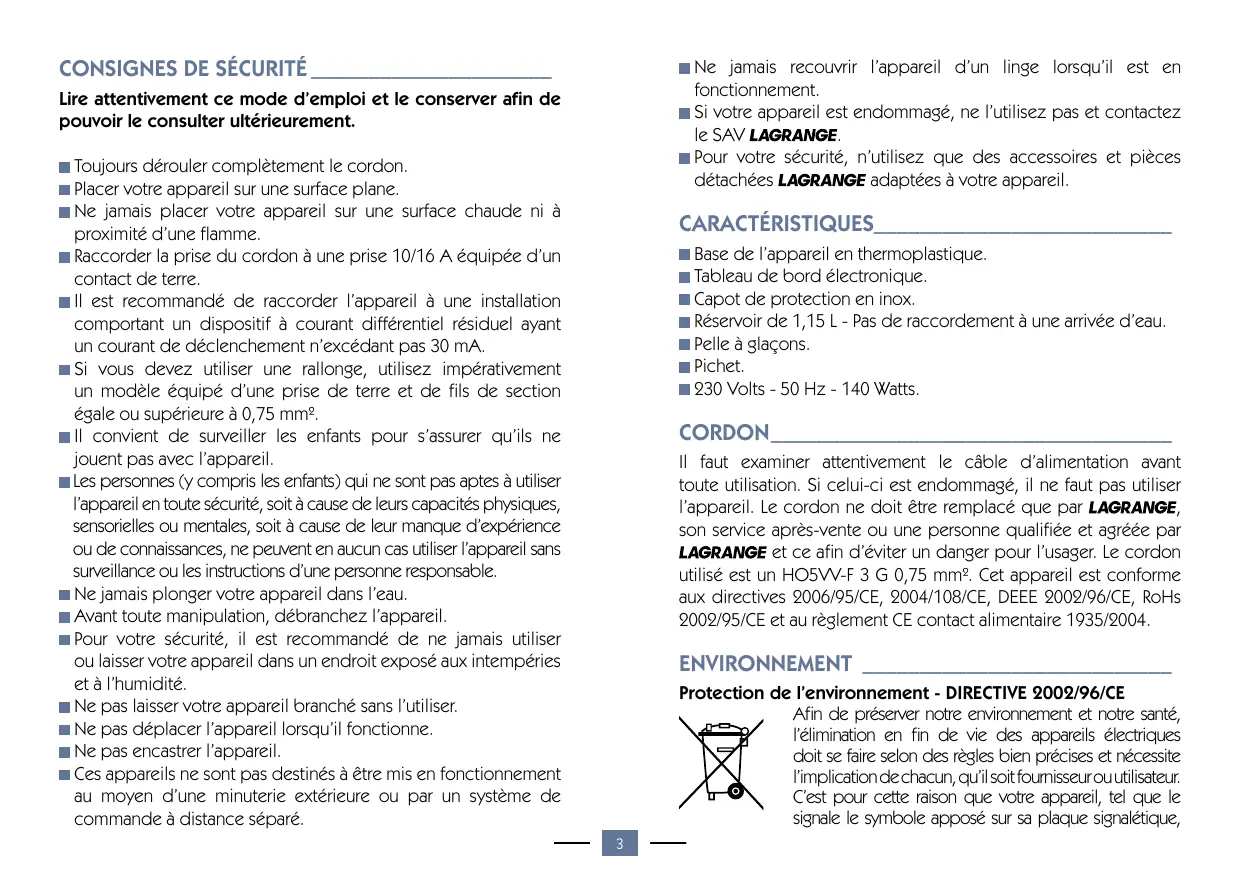 Consignes de sécurité______________________ e jamais recouvrir l’appareil d’un linge lorsqu’il est en fonctionnement. Si votre appareil est endommagé, ne l’utilisez pas et contactez le SAV Pour votre sécurité, n’utilisez que des accessoires et pièces détachées adaptées à votre appareil. Lire attentivement ce mode d’emploi et le conserver afin de pouvoir le consulter ultérieurement. T oujours dérouler complètement le cordon. Placer votre appareil sur une surface plane. Ne jamais placer votre appareil sur une surface chaude ni à proximité d’une flamme. Raccorder la prise du cordon à une prise 10/16 A équipée d’un contact de terre. Il est recommandé de raccorder l’appareil à une installation comportant un dispositif à courant différentiel résiduel ayant un courant de déclenchement n’excédant pas 30 mA. Si vous devez utiliser une rallonge, utilisez impérativement un modèle équipé d’une prise de terre et de fils de section égale ou supérieure à 0,75 mm². Il convient de surveiller les enfants pour s’assurer qu’ils ne jouent pas avec l’appareil. Les personnes (y compris les enfants) qui ne sont pas aptes à utiliser l’appareil en toute sécurité, soit à cause de leurs capacités physiques, sensorielles ou mentales, soit à cause de leur manque d’expérience ou de connaissances, ne peuvent en aucun cas utiliser l’appareil sans surveillance ou les instructions d’une personne responsable. Ne jamais plonger votre appareil dans l’eau. Avant toute manipulation, débranchez l’appareil. Pour votre sécurité, il est recommandé de ne jamais utiliser ou laisser votre appareil dans un endroit exposé aux intempéries et à l’humidité. Ne pas laisser votre appareil branché sans l’utiliser. Ne pas déplacer l’appareil lorsqu’il fonctionne. Ne pas encastrer l’appareil. Ces appareils ne sont pas destinés à être mis en fonctionnement au moyen d’une minuterie extérieure ou par un système de commande à distance séparé. Caractéristiques__________________________ B ase de l’appareil en thermoplastique. Tableau de bord électronique. Capot de protection en inox. Réservoir de 1,15 L - Pas de raccordement à une arrivée d’eau. Pelle à glaçons. Pichet. 230 Volts - 50 Hz - 140 Watts. Cordon____________________________________ Il faut examiner attentivement le câble d’alimentation avant toute utilisation. Si celui-ci est endommagé, il ne faut pas utiliser l’appareil. Le cordon ne doit être remplacé que par son service après-vente ou une personne qualifiée et agréée par et ce afin d’éviter un danger pour l’usager. Le cordon utilisé est un HO5VV-F 3 G 0,75 mm². Cet appareil est conforme aux directives 2006/95/CE, 2004/108/CE, DEEE 2002/96/CE, RoHs 2002/95/CE et au règlement CE contact alimentaire 1935/2004. Environnement_ ___________________________ Protection de l’environnement - DIRECTIVE 2002/96/CE Afin de préserver notre environnement et notre santé, l’élimination en fin de vie des appareils électriques doit se faire selon des règles bien précises et nécessite l’implication de chacun, qu’il soit fournisseur ou utilisateur. C’est pour cette raison que votre appareil, tel que le signale le symbole apposé sur sa plaque signalétique,