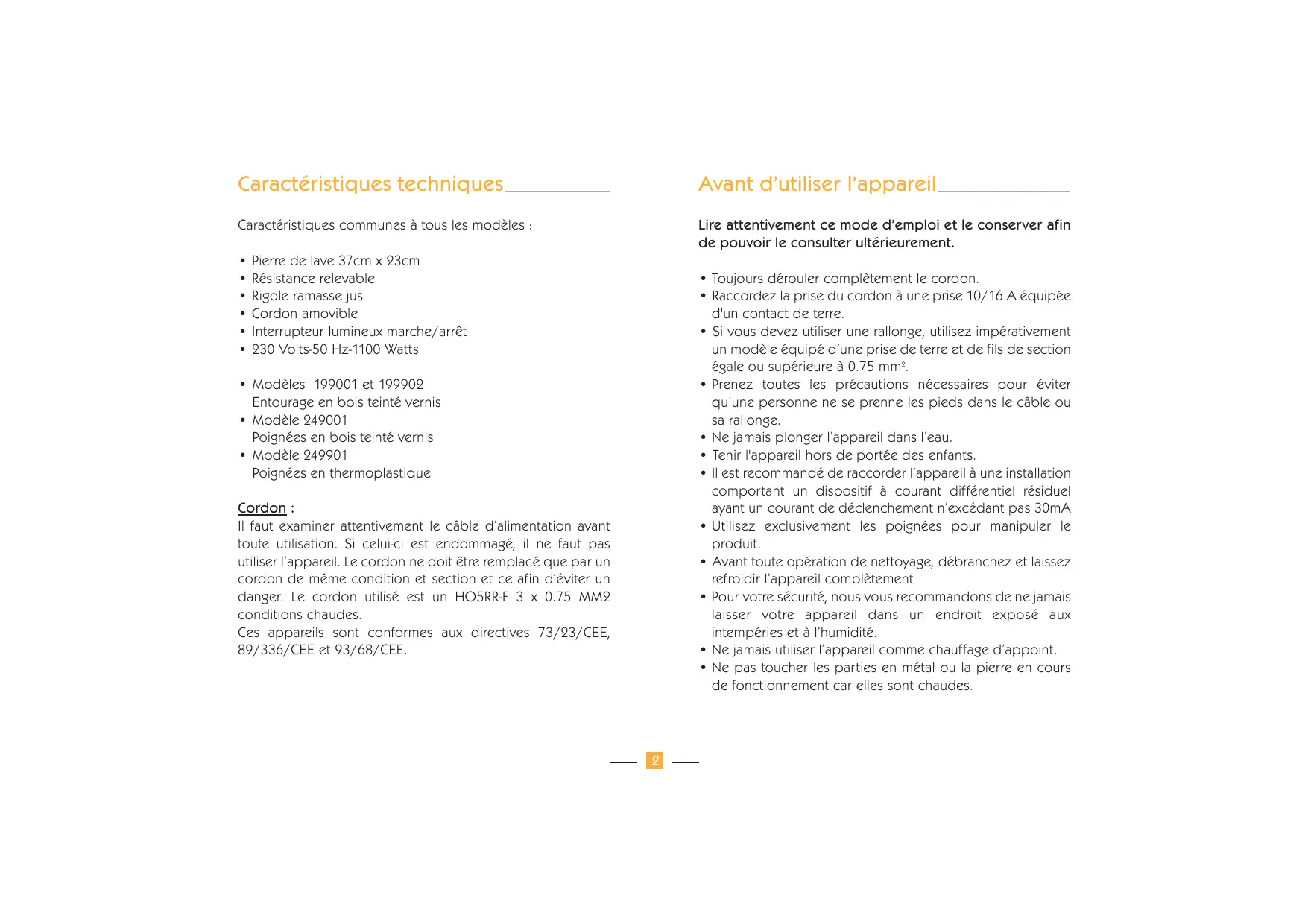 - Modèle 249901 Poignées en thermoplastique Cordon : Il faut examiner attentivement le câble d’alimentation avant toute utilisation. Si celui-ci est endommagé, il ne faut pas utiliser l’appareil. Le cordon ne doit être remplacé que par un cordon de même condition et section et ce afin d’éviter un danger. Le cordon utilisé est un HO5RR-F 3 x 0.75 MM2 conditions chaudes. Ces appareils sont conformes aux directives 73/23/CEE, 89/336/CEE et 93/68/CEE.