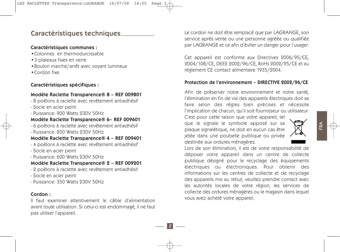 - Cordon fixe Cet appareil est conforme aux Directives 2006/95/CE, 2004/108/CE, DEEE 2002/96/CE, RoHs 2002/95/CE et au règlement CE contact alimentaire 1935/2004. Caractéristiques spécifiques : Protection de l’environnement – DIRECTIVE 2002/96/CE Modèle Raclette Transparence® 8 – REF 009801 - 8 poêlons à raclette avec revêtement antiadhésif - Socle en acier peint - Puissance: 900 Watts 230V 50Hz Modèle Raclette Transparence® 6– REF 009601 - 6 poêlons à raclette avec revêtement antiadhésif - Puissance: 850 Watts 230V 50Hz Modèle Raclette Transparence® 4 – REF 009401 - 4 poêlons à raclette avec revêtement antiadhésif - Socle en acier peint - Puissance: 600 Watts 230V 50Hz Modèle Raclette Transparence® 2 – REF 009201 - 2 poêlons à raclette avec revêtement antiadhésif - Socle en acier peint - Puissance: 350 Watts 230V 50Hz Afin de préserver notre environnement et notre santé, l’élimination en fin de vie des appareils électriques doit se faire selon des règles bien précises et nécessite l’implication de chacun, qu’il soit fournisseur ou utilisateur. C’est pour cette raison que votre appareil, tel que le signale le symbole apposé sur sa plaque signalétique, ne doit en aucun cas être jetée dans une poubelle publique ou privée destinée aux ordures ménagères. Lors de son élimination, il est de votre responsabilité de déposer votre appareil dans un centre de collecte publique désigné pour le recyclage des équipements électriques ou électroniques. Pour obtenir des informations sur les centres de collecte et de recyclage des appareils mis au rebut, veuillez prendre contact avec les autorités locales de votre région, les services de collecte des ordures ménagères ou le magasin dans lequel vous avez acheté votre appareil. Cordon : Il faut examiner attentivement le câble d’alimentation avant toute utilisation. Si celui-ci est endommagé, il ne faut pas utiliser l’appareil.