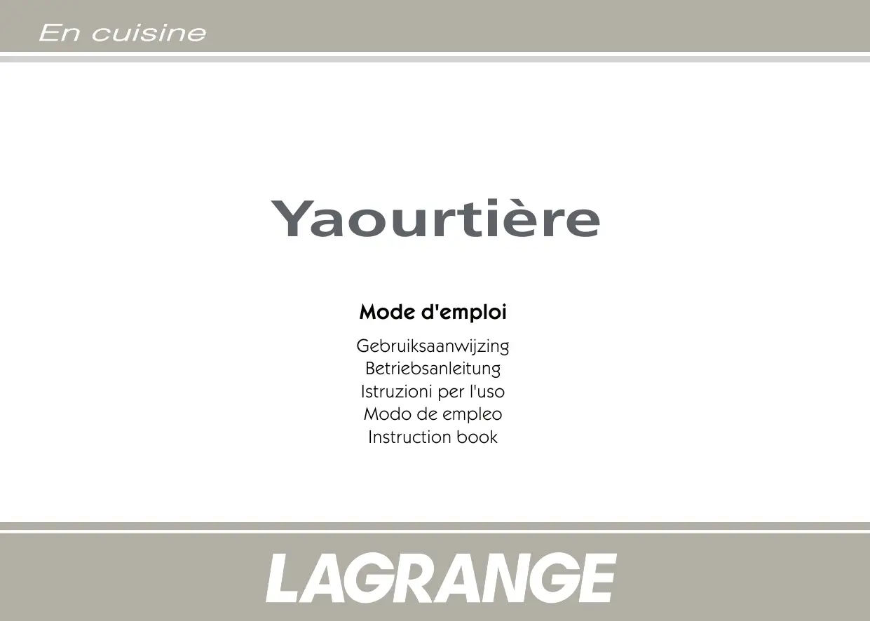 Mode d'emploi Gebruiksaanwijzing Ecran électronique avec rétro-éclairage Signal sonore de fin de préparation 230Volts-50Hz-13Watts Accessoires en vente chez LAGRANGE : 7 pots en verre à couvercle vissant Cordon Il faut examiner attentivement le câble d’alimentation avant toute utilisation. Si celui-ci est endommagé, il ne faut pas utiliser l’appareil. Le cordon ne doit être remplacé que par LAGRANGE, son service après-vente ou une personne agréée ou qualifiée par LAGRANGE et ce afin d’éviter un danger pour l’usager. Cet appareil est conforme aux Directives 2006/95/CE, 2004/108/CE, DEEE 2002/96/CE, RoHs 2002/95/CE et au règlement CE contact alimentaire 1935/2004.