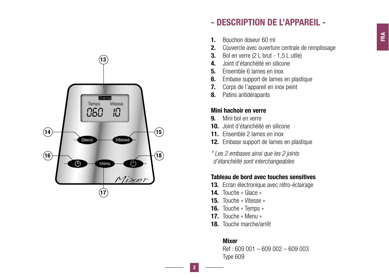 Bol en verre gradué, capacité 2 L bruts - 1,5 L utile. Couteau 6 branches en étoile. Tableau de bord avec écran électronique et touches sensitives. 6 modes prédéfinis + fonction « glace ». 10 vitesses. Réglage du temps de mixage et minuterie électronique avec arrêt automatique. Mini hachoir en verre. 22000 tours/minute. 230 Volts - 50 Hz - 1 000 Watts.