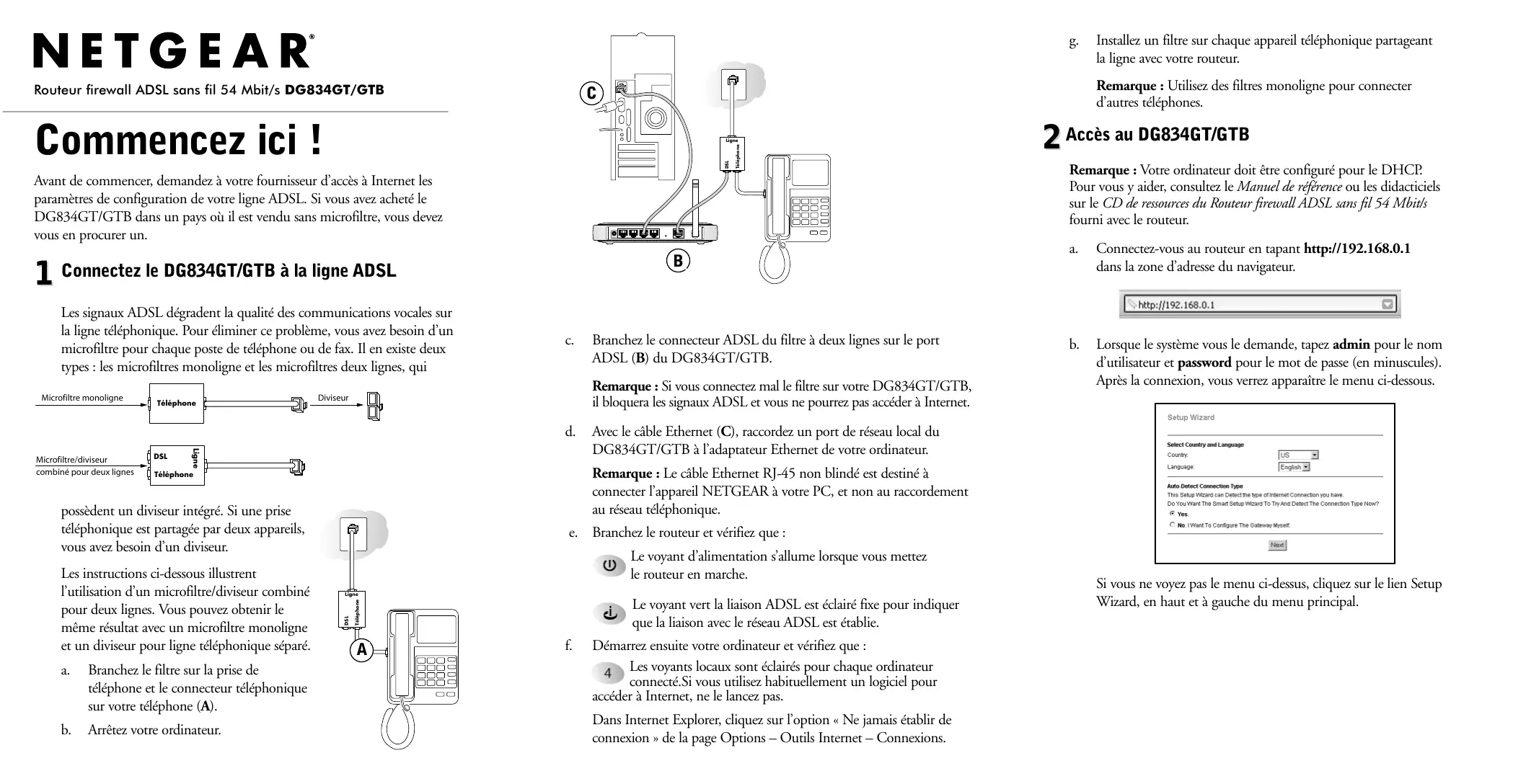Lorsque le système vous le demande, tapez admin pour le nom d’utilisateur et password pour le mot de passe (en minuscules). Après la connexion, vous verrez apparaître le menu ci-dessous. Avec le câble Ethernet (C), raccordez un port de réseau local du DG834GT/GTB à l’adaptateur Ethernet de votre ordinateur. Remarque : Le câble Ethernet RJ-45 non blindé est destiné à connecter l’appareil NETGEAR à votre PC, et non au raccordement au réseau téléphonique. Téléphone e. Branchez le routeur et vérifiez que : Le voyant d’alimentation s’allume lorsque vous mettez le routeur en marche. DSL Ligne Le voyant vert la liaison ADSL est éclairé fixe pour indiquer que la liaison avec le réseau ADSL est établie. Téléphone Les instructions ci-dessous illustrent l’utilisation d’un microfiltre/diviseur combiné pour deux lignes. Vous pouvez obtenir le même résultat avec un microfiltre monoligne et un diviseur pour ligne téléphonique séparé. Branchez le connecteur ADSL du filtre à deux lignes sur le port ADSL (B) du DG834GT/GTB. Remarque : Si vous connectez mal le filtre sur votre DG834GT/GTB, il bloquera les signaux ADSL et vous ne pourrez pas accéder à Internet. Diviseur Installez un filtre sur chaque appareil téléphonique partageant la ligne avec votre routeur.