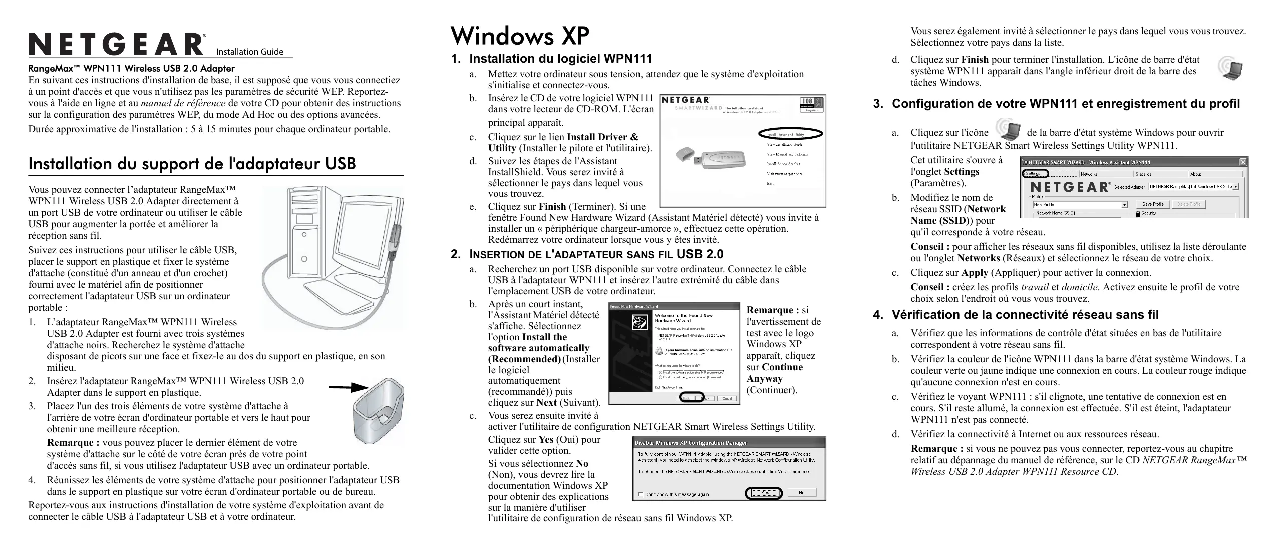 a. Recherchez un port USB disponible sur votre ordinateur. Connectez le câble USB à l'adaptateur WPN111 et insérez l'autre extrémité du câble dans l'emplacement USB de votre ordinateur. b. Après un court instant, Remarque : si l'Assistant Matériel détecté l'avertissement de s'affiche. Sélectionnez test avec le logo l'option Install the Windows XP software automatically apparaît, cliquez (Recommended) (Installer sur Continue le logiciel Anyway automatiquement (Continuer). (recommandé)) puis cliquez sur Next (Suivant). c. Vous serez ensuite invité à activer l'utilitaire de configuration NETGEAR Smart Wireless Settings Utility. Cliquez sur Yes (Oui) pour valider cette option. Si vous sélectionnez No (Non), vous devrez lire la documentation Windows XP pour obtenir des explications sur la manière d'utiliser l'utilitaire de configuration de réseau sans fil Windows XP. Vous serez également invité à sélectionner le pays dans lequel vous vous trouvez. Sélectionnez votre pays dans la liste. Cliquez sur Finish pour terminer l'installation. L'icône de barre d'état système WPN111 apparaît dans l'angle inférieur droit de la barre des tâches Windows.