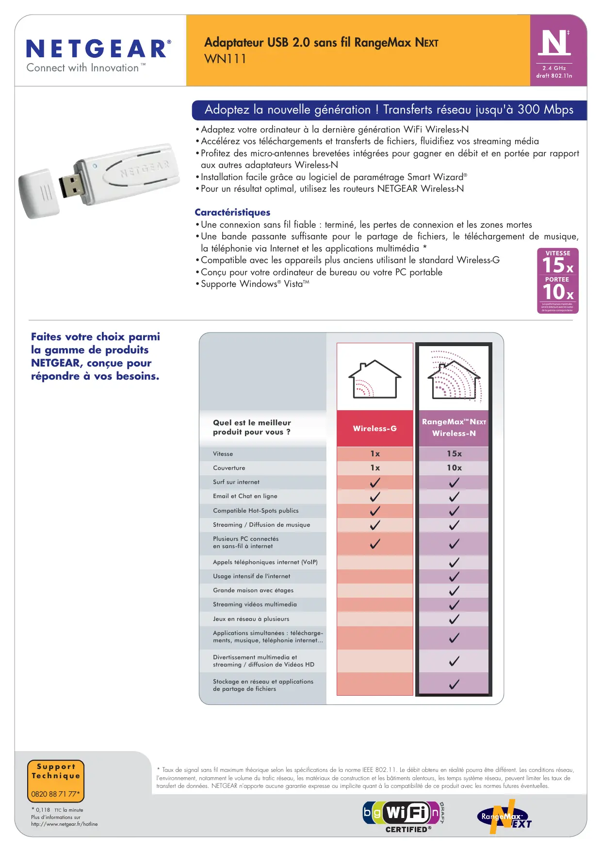 10x Surf sur internet Email et Chat en ligne Compatible Hot-Spots publics Streaming / Diffusion de musique Plusieurs PC connectés en sans-fil à internet Appels téléphoniques internet (VoIP) Usage intensif de l'internet Grande maison avec étages Streaming vidéos multimedia Jeux en réseau à plusieurs Applications simultanées : téléchargements, musique, téléphonie internet... Divertissement multimedia et streaming / diffusion de Vidéos HD Stockage en réseau et applications de partage de fichiers Support Te c h n i q u e 0820 88 71 77*