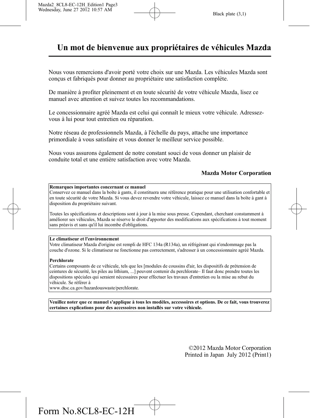 Informations importantes pour le client incluant les garanties et les accessoires. Spécifications Informations techniques sur votre véhicule Mazda. Index Form No.8CL8-EC-12H