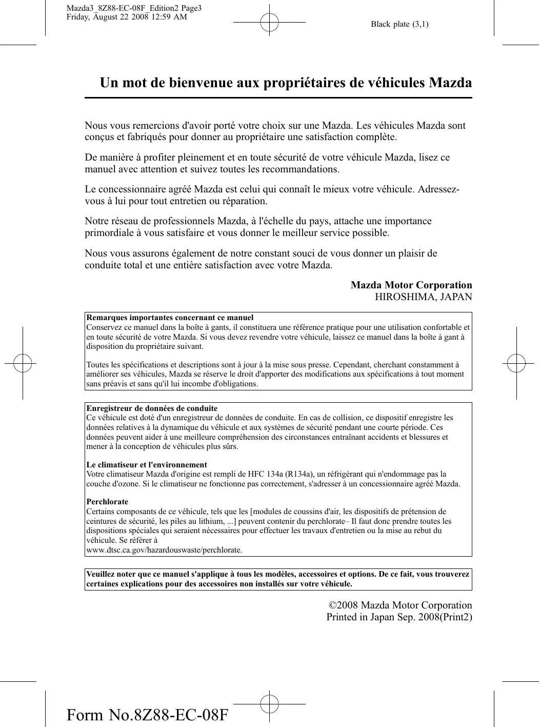 Conserve ce manuel dans la boite à gants, it constituya une reference pratique pour une utilisation comfortable et en toute sécurité de votre Mazda. Si vous nevez revendre votre vehicule, laissez ce manuel dans la boite a gant a disposition du proprieteaire suivant.