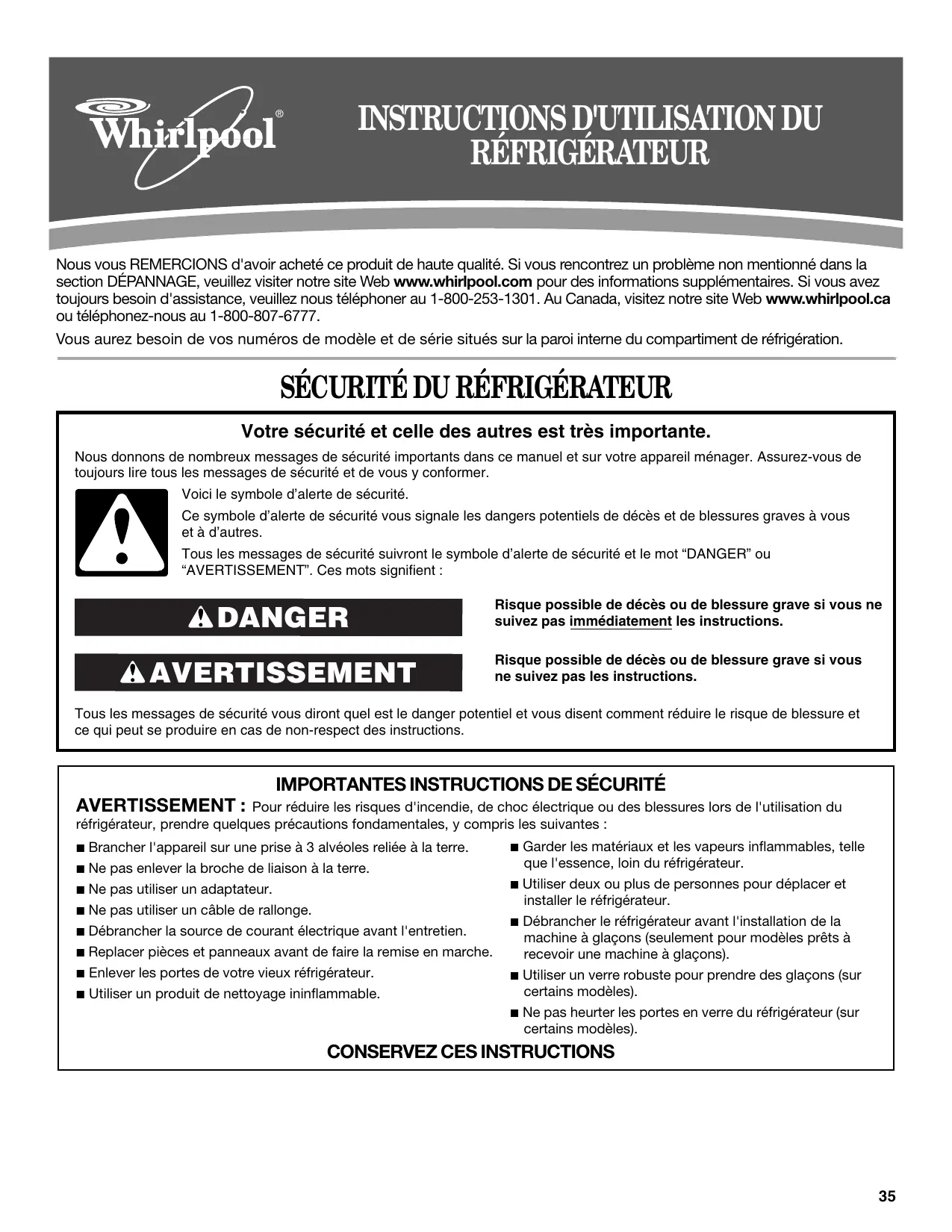 Nous vous REMERCIONS d'avoir acheté ce produit de haute qualité. Si vous rencontrez un problème non mentionné dans la section DÉPANNAGE, veuillez visiter notre site Web www.whirlpool.com pour des informations supplémentaires. Si vous avez toujours besoin d'assistance, veuillez nous téléphoner au 1-800-253-1301. Au Canada, visitez notre site Web www.whirlpool.ca ou téléphonez-nous au 1-800-807-6777. Vous aurez besoin de vos numéros de modèle et de série situés sur la paroi interne du compartiment de réfrigération.