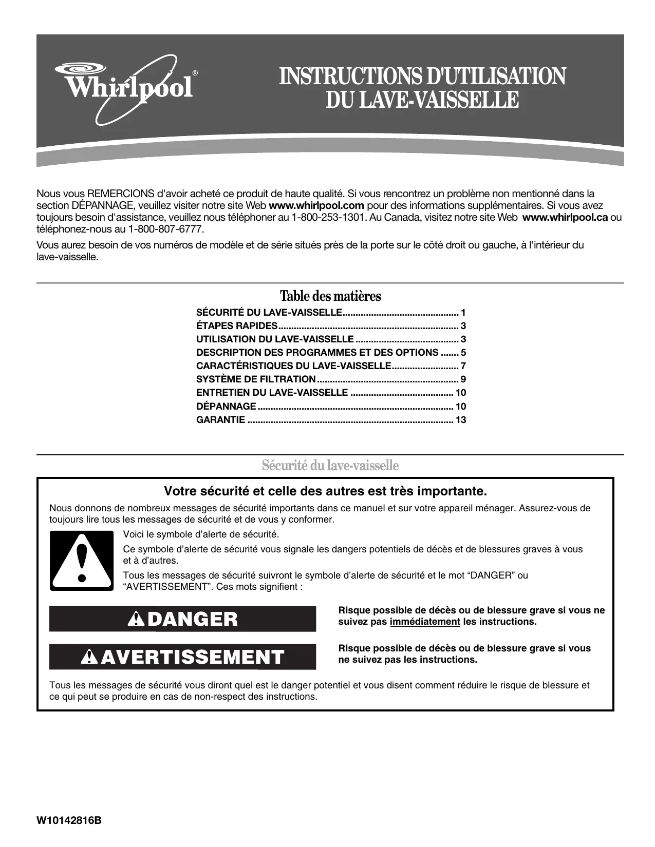 DÉPANNAGE ............................................................................ 10 GARANTIE ................................................................................ 13 Sécurité du lave-vaisselle Votre sécurité et celle des autres est très importante. Nous donnons de nombreux messages de sécurité importants dans ce manuel et sur votre appareil ménager. Assurez-vous de toujours lire tous les messages de sécurité et de vous y conformer. Voici le symbole d’alerte de sécurité. Ce symbole d’alerte de sécurité vous signale les dangers potentiels de décès et de blessures graves à vous et à d’autres. Tous les messages de sécurité suivront le symbole d’alerte de sécurité et le mot “DANGER” ou “AVERTISSEMENT”. Ces mots signifient : DANGER AVERTISSEMENT Risque possible de décès ou de blessure grave si vous ne suivez pas immédiatement les instructions. Risque possible de décès ou de blessure grave si vous ne suivez pas les instructions. Tous les messages de sécurité vous diront quel est le danger potentiel et vous disent comment réduire le risque de blessure et ce qui peut se produire en cas de non-respect des instructions. W10142816B