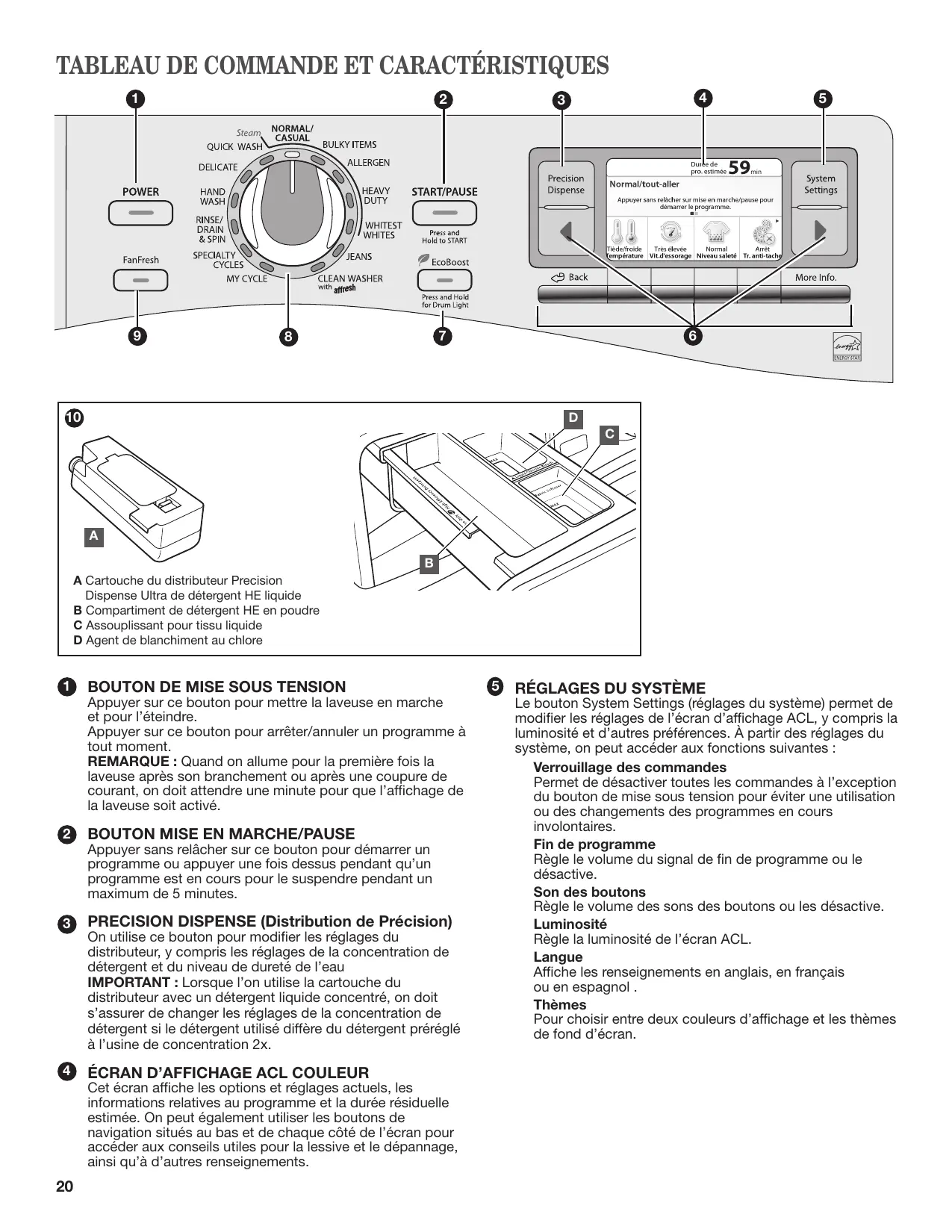 boutons de commande ACL. REMARQUE : n O n doit rincer la cartouche de détergent si l’on change de détergent ou si l’on n’utilise pas la laveuse pendant une période prolongée. Pour les instructions concernant le nettoyage de la cartouche du distributeur, voir « Entretien de la laveuse ».